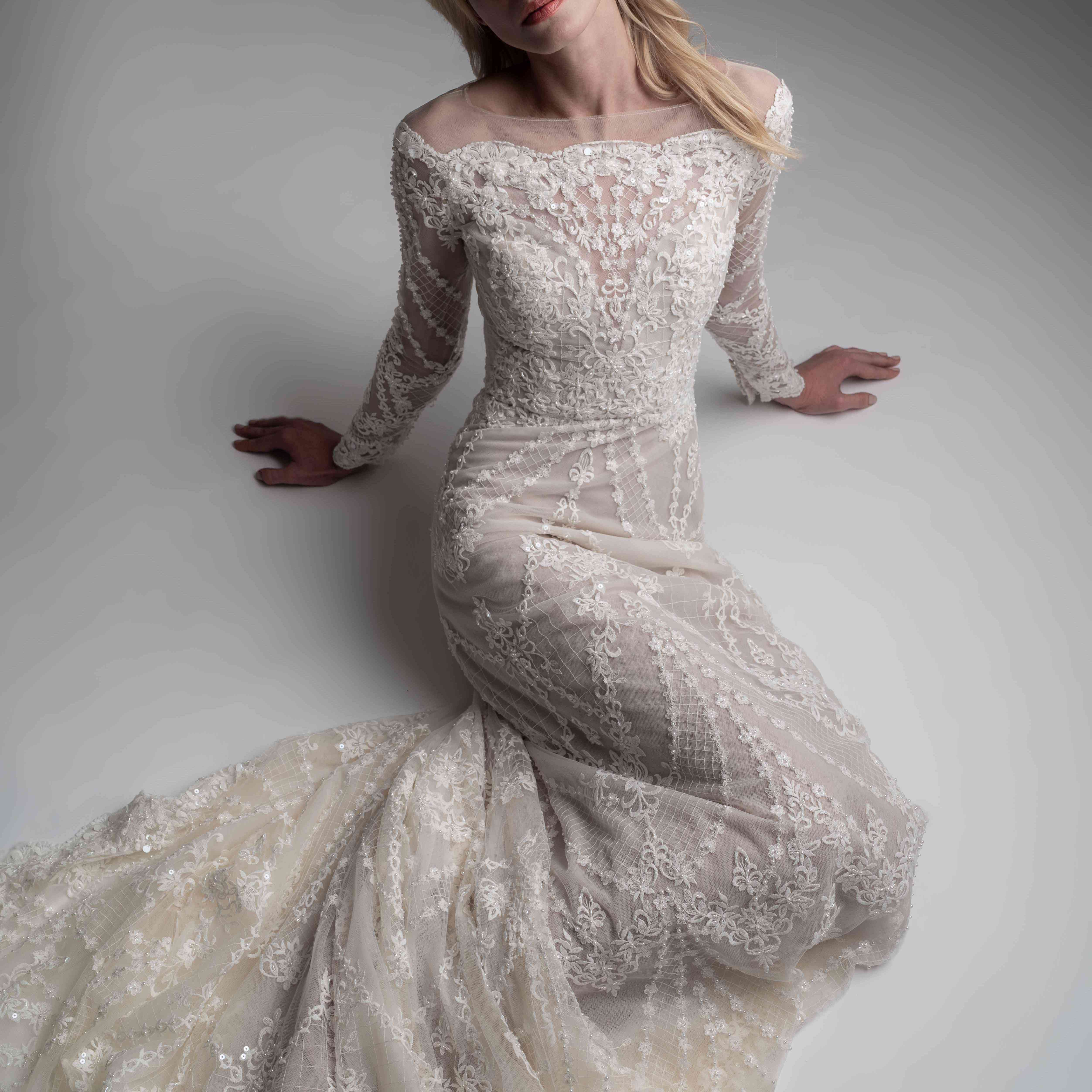 “海伦娜”露肩长袖a字型礼服刺绣和串珠花边。