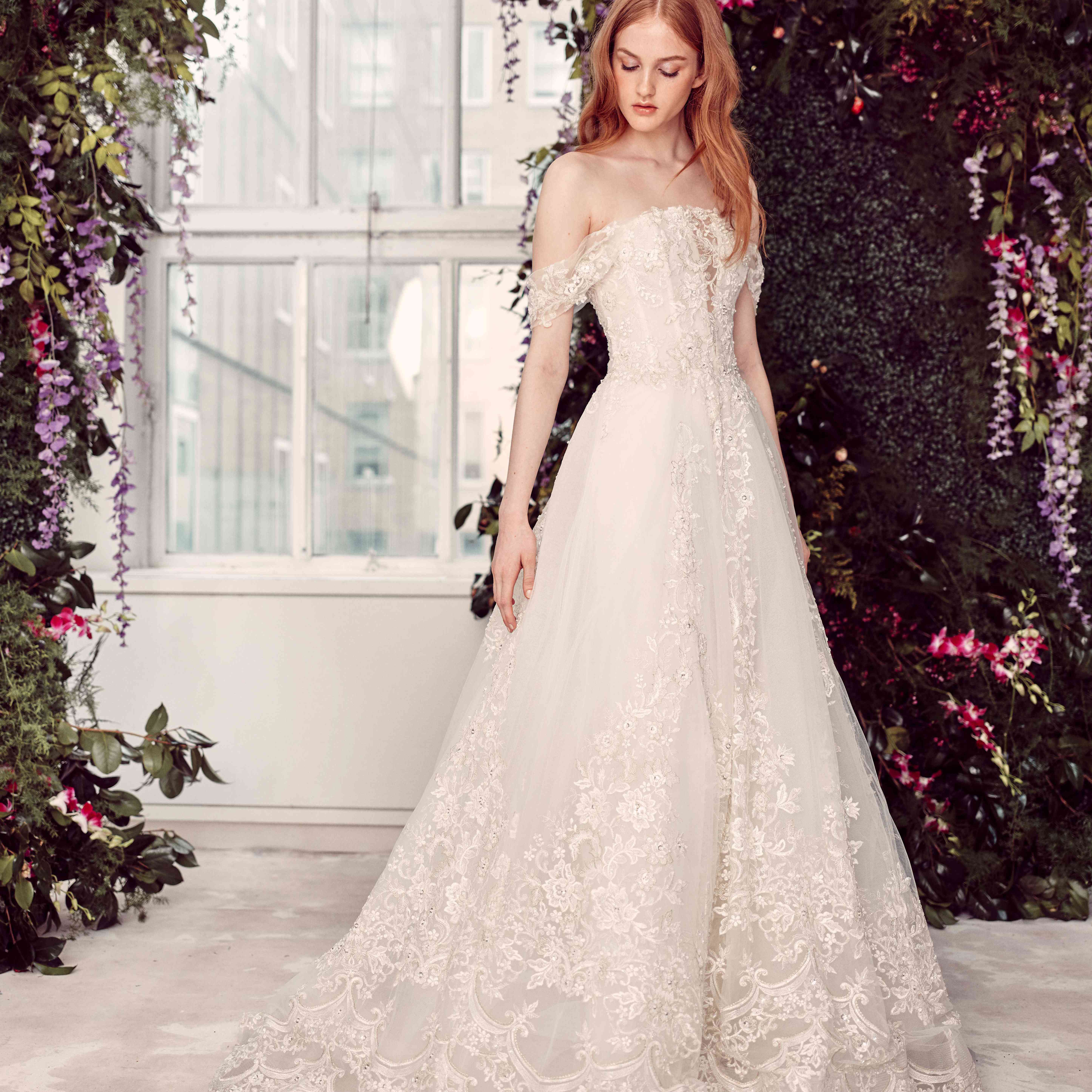 “达勒姆”露肩公主舞会礼服与串珠和刺绣花边。