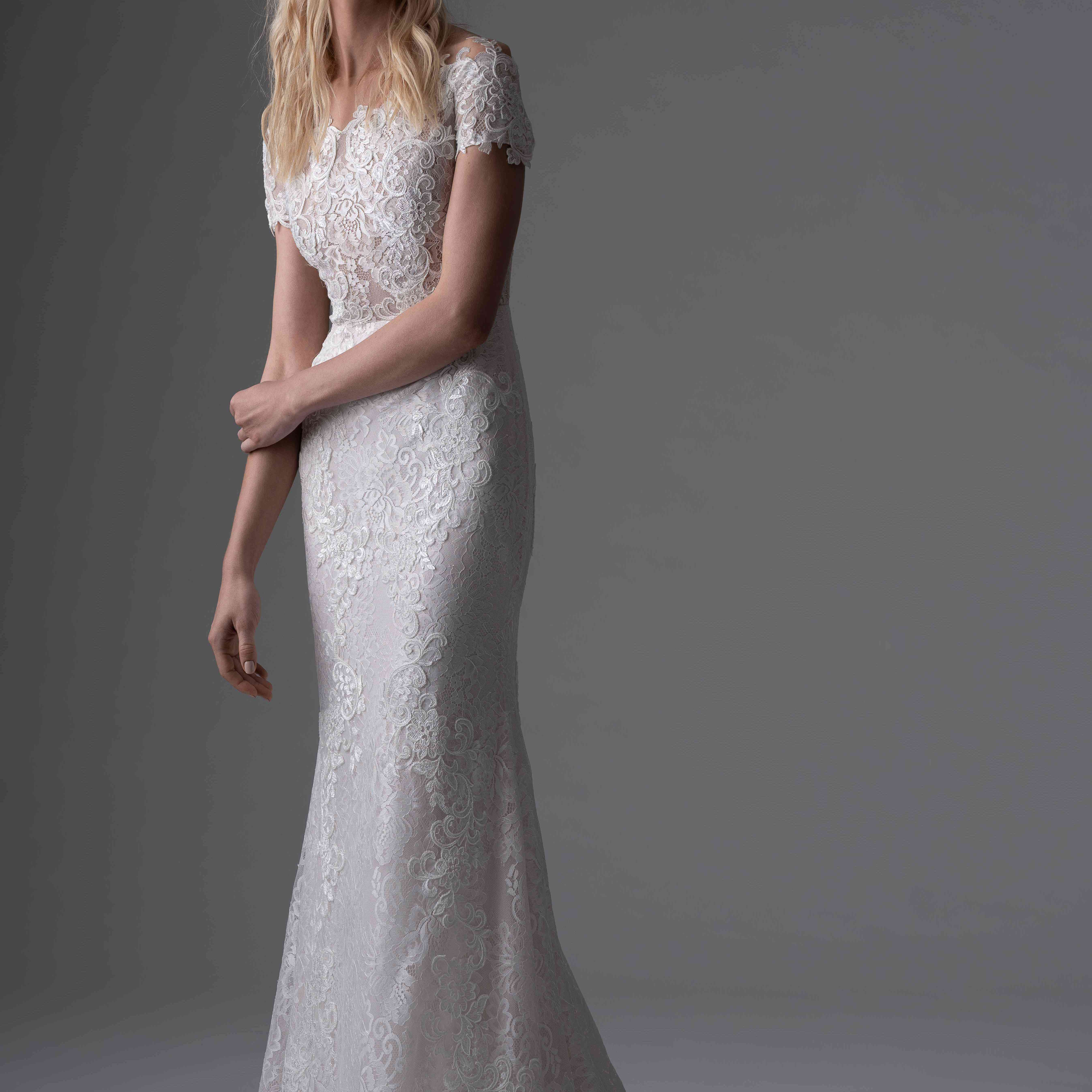 “凯尔”合身和耀斑胸衣礼服在现代精致的蕾丝。