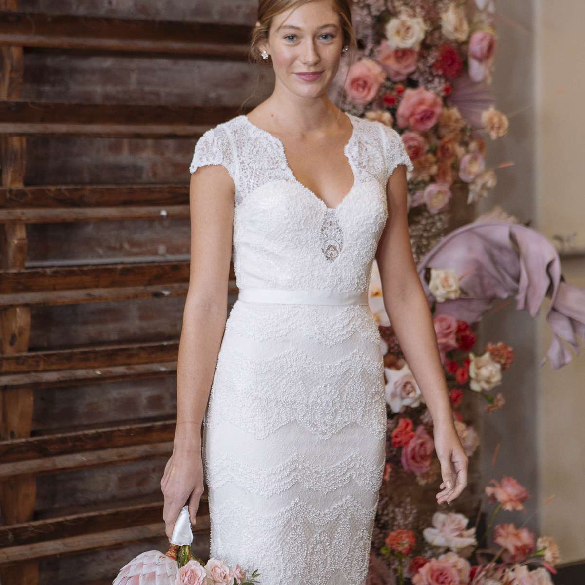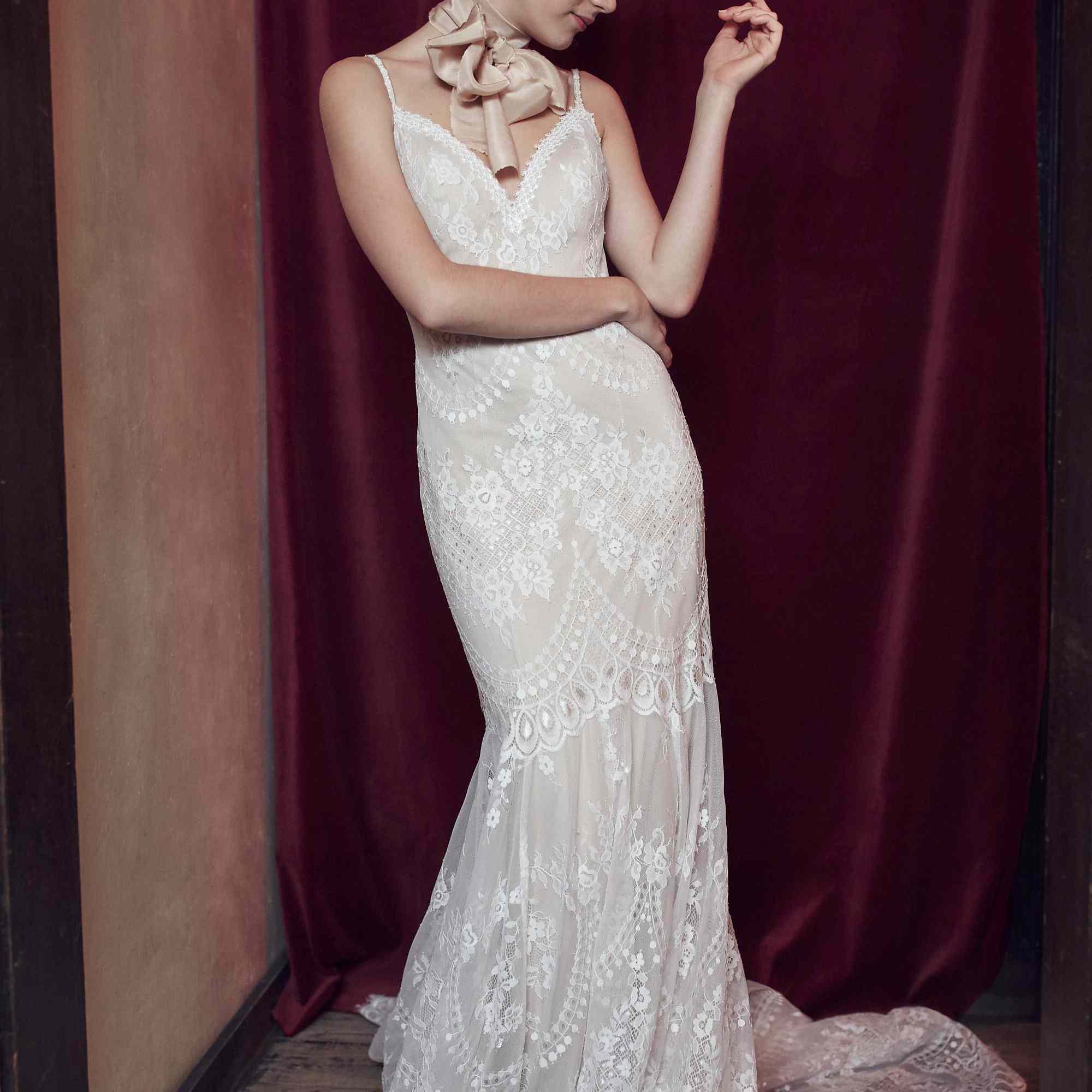 Wtoo by Watters设计的“Dixie”v领蕾丝紧身婚纱。