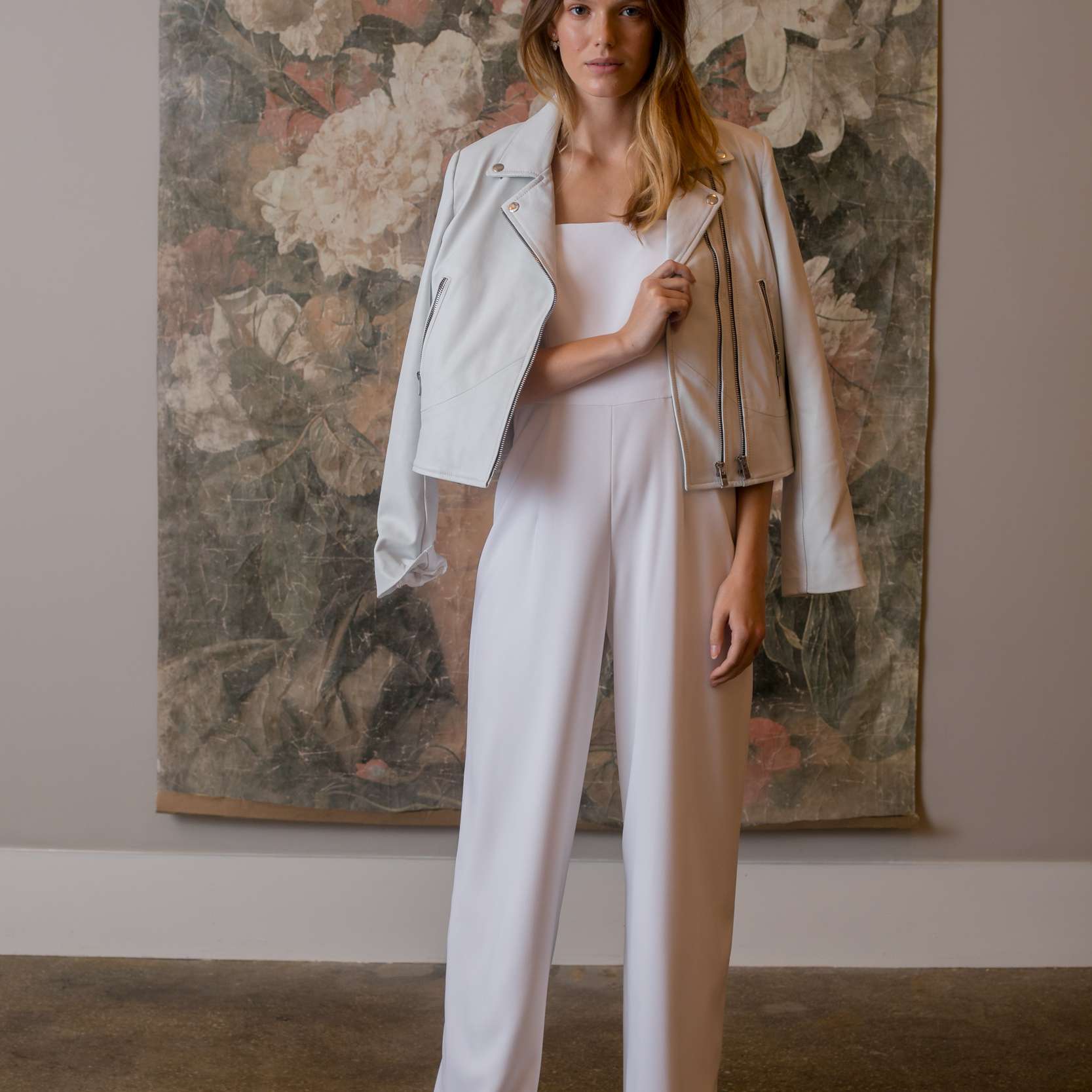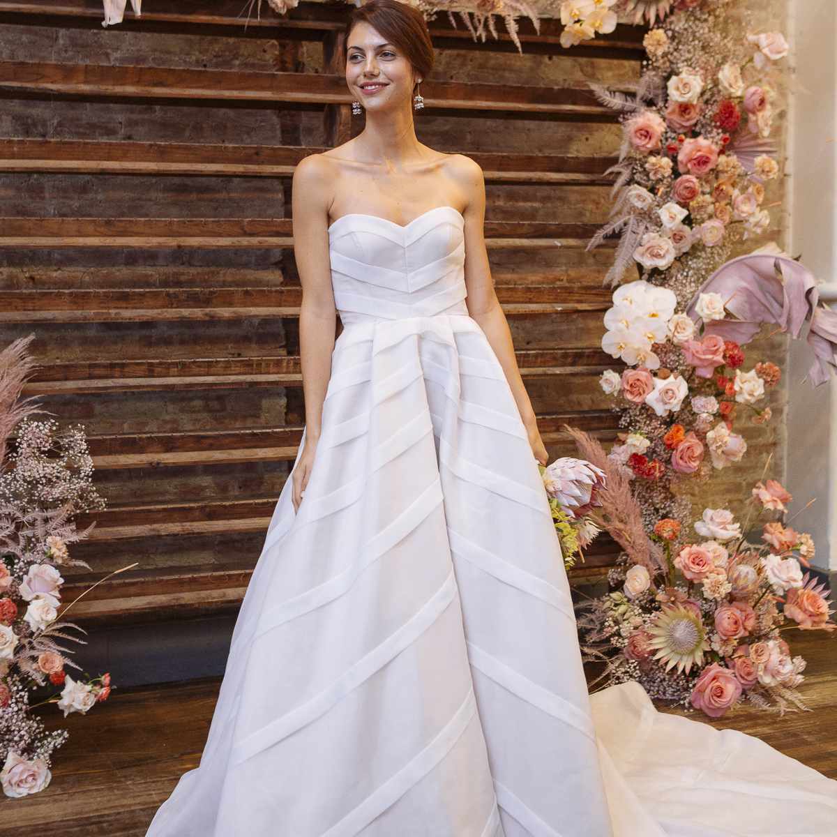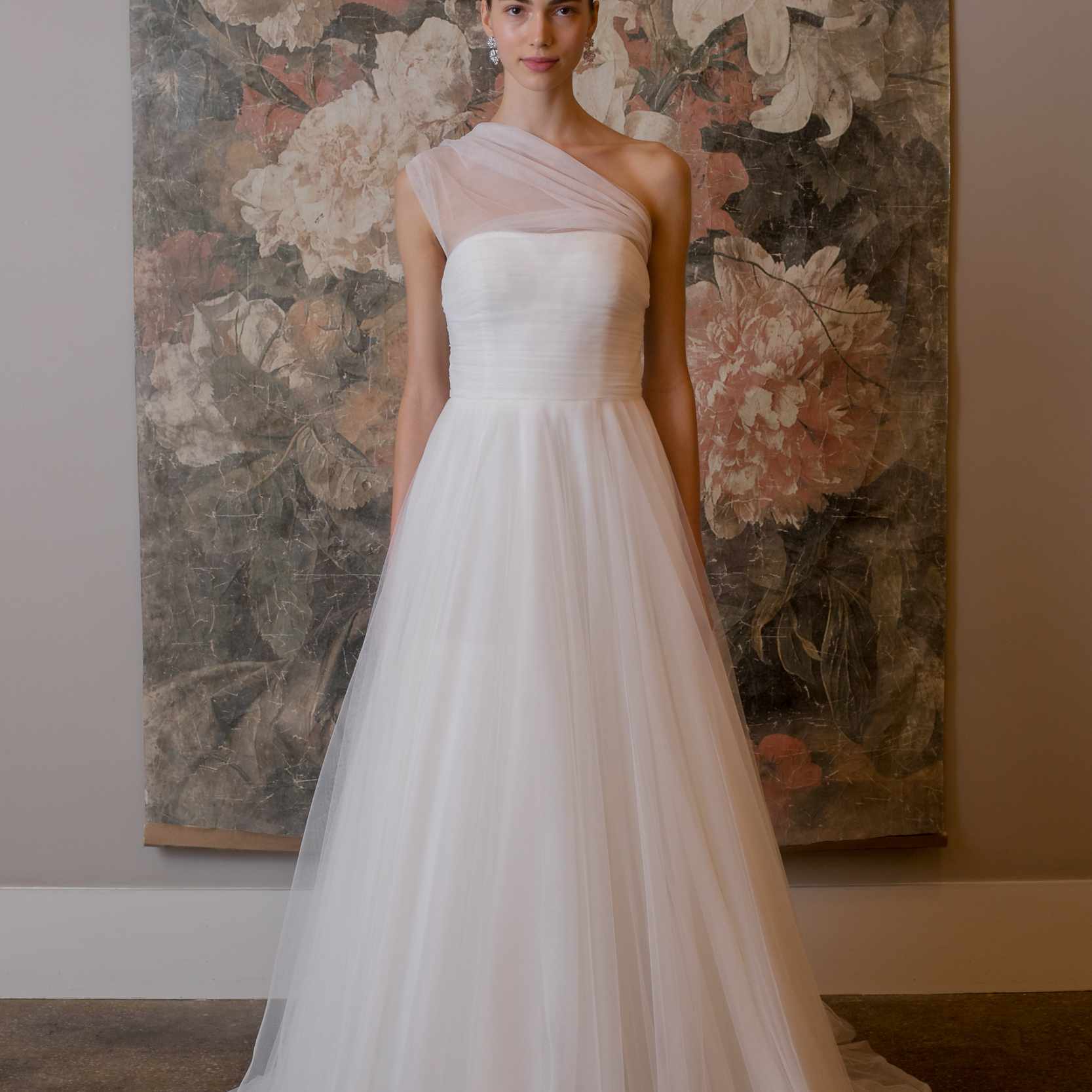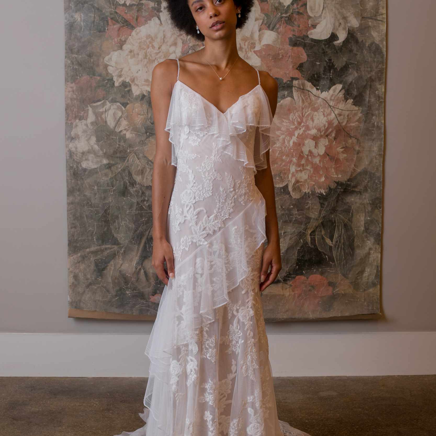 “Cera”a字婚纱与意大利细肩带和薄纱裙由Amsale。