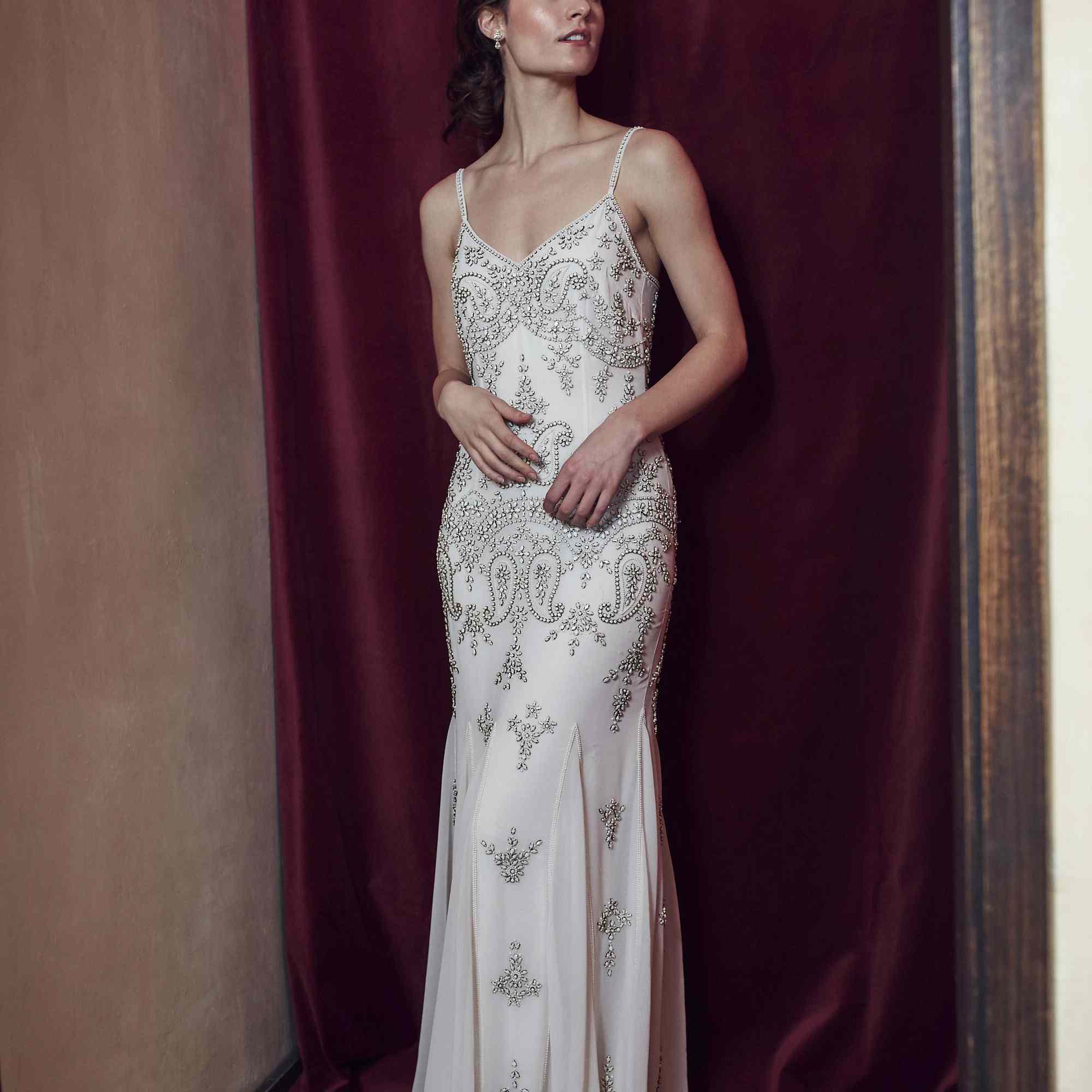 由Jenny by Jenny Yoo设计的“Shipley”吊带紧身婚纱。