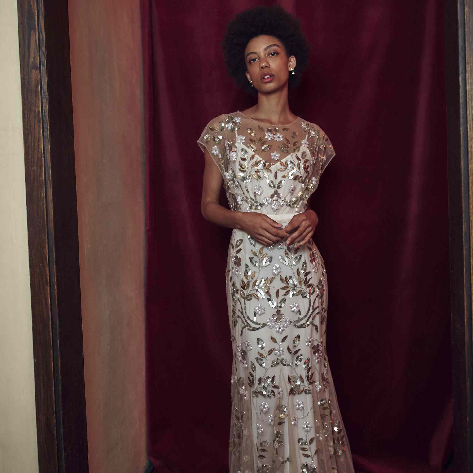 由BHLDN设计的“圣母峰”珠饰圆柱礼服。