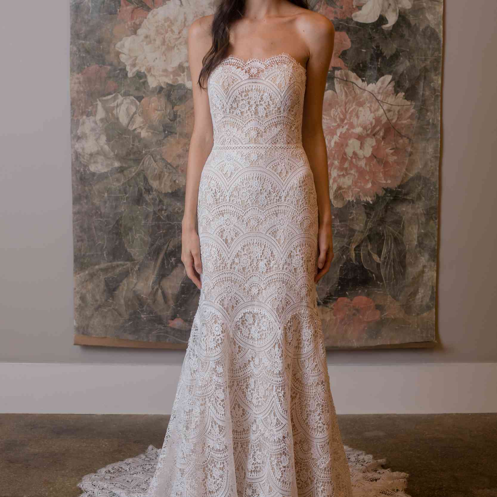 “查尔斯顿”无肩带蕾丝婚纱裙。
