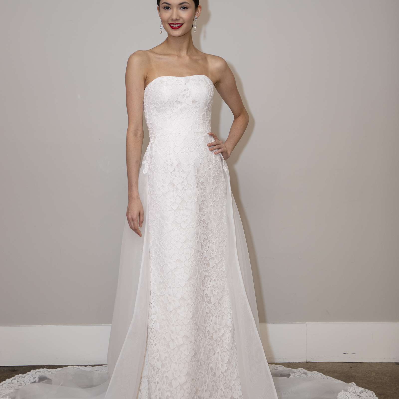 由Willowby by Watters设计的“Brannox”无肩带柱式婚纱可拆卸薄纱裙。