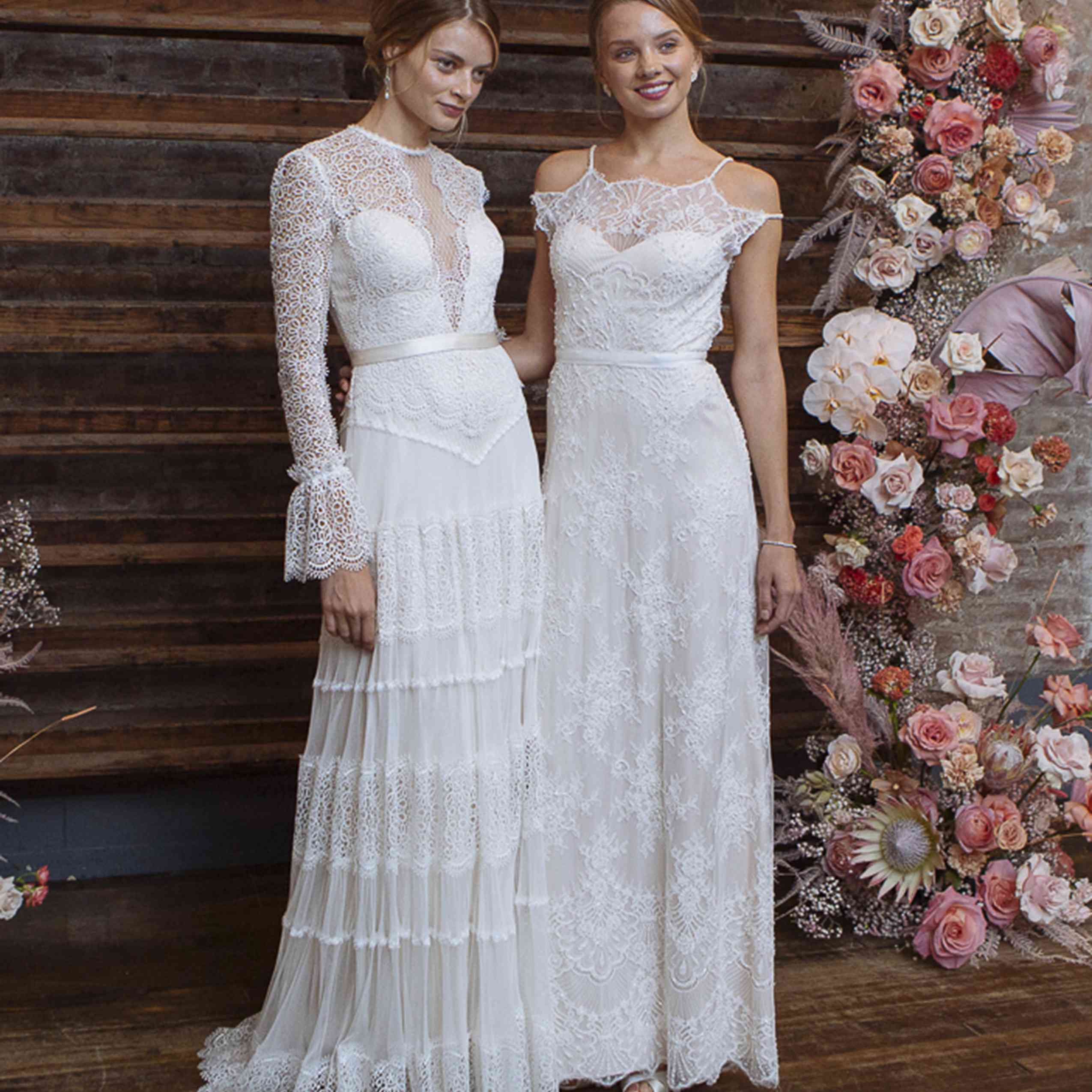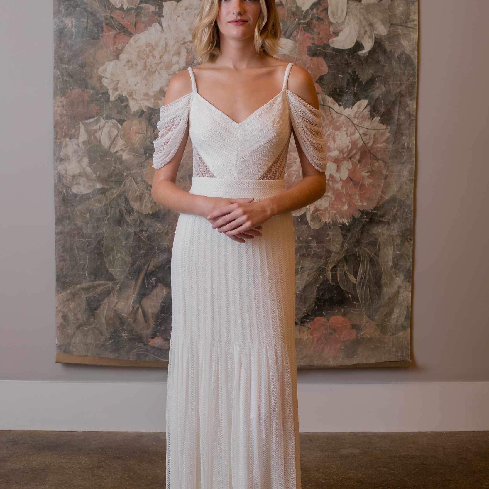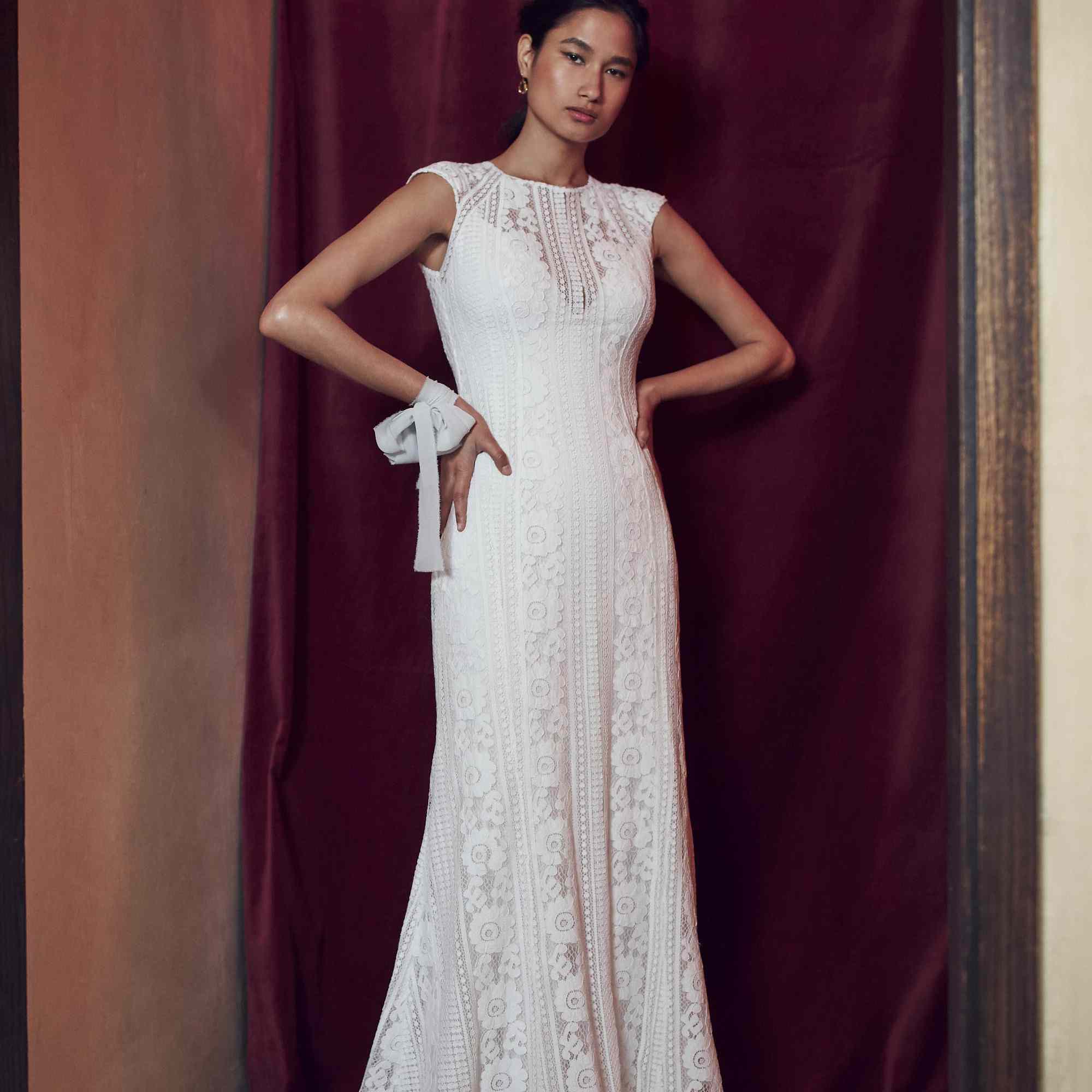 在真正的BHLDN时尚中,有真正的礼服任何新娘的风格。认为自己是一个随意的新娘?穿上“萨顿”,一件柔软的披风领和裙摆的绸缎滑裙。在寻找你的公主时刻吗?给“海明威”一曲欧根纱舞会礼服。或者你想在婚礼当天成为一个成熟老练的人?“吠达”,一件别致的低胸礼服,蕾丝袖子和绉纱裙,是你的答案。然而,对康利来说,最重要的是“凯琳”的裙子。她说:“从超柔软精致的全丝裙到错综复杂的线形珍珠后背,这件礼服从头到脚都是完美的。”