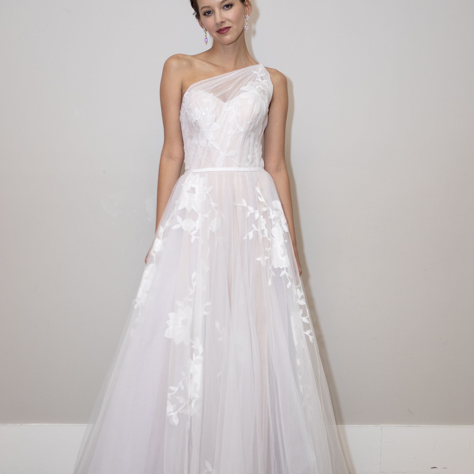 “蒂格”单肩薄纱婚纱与花卉口音。