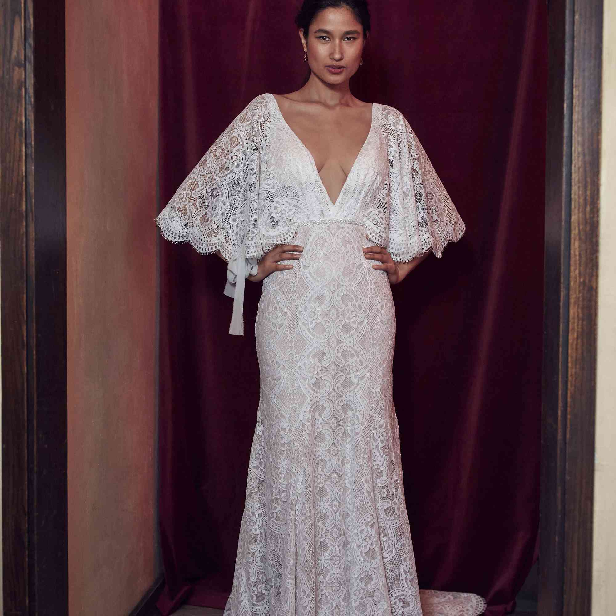 “Odalis”钩针花边婚纱与向后和流动的袖子由BHLDN。