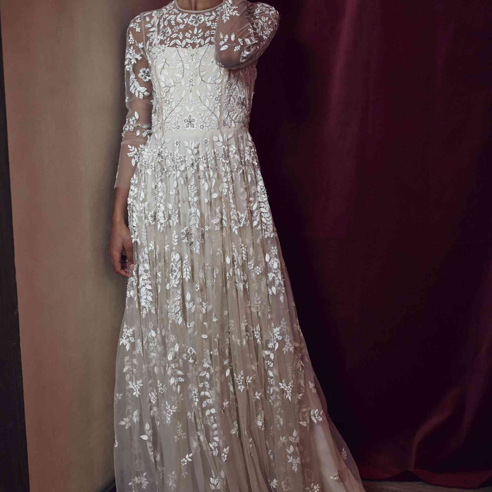 “马瑟琳”高领婚纱与错觉脖子和花卉贴花BHLDN。