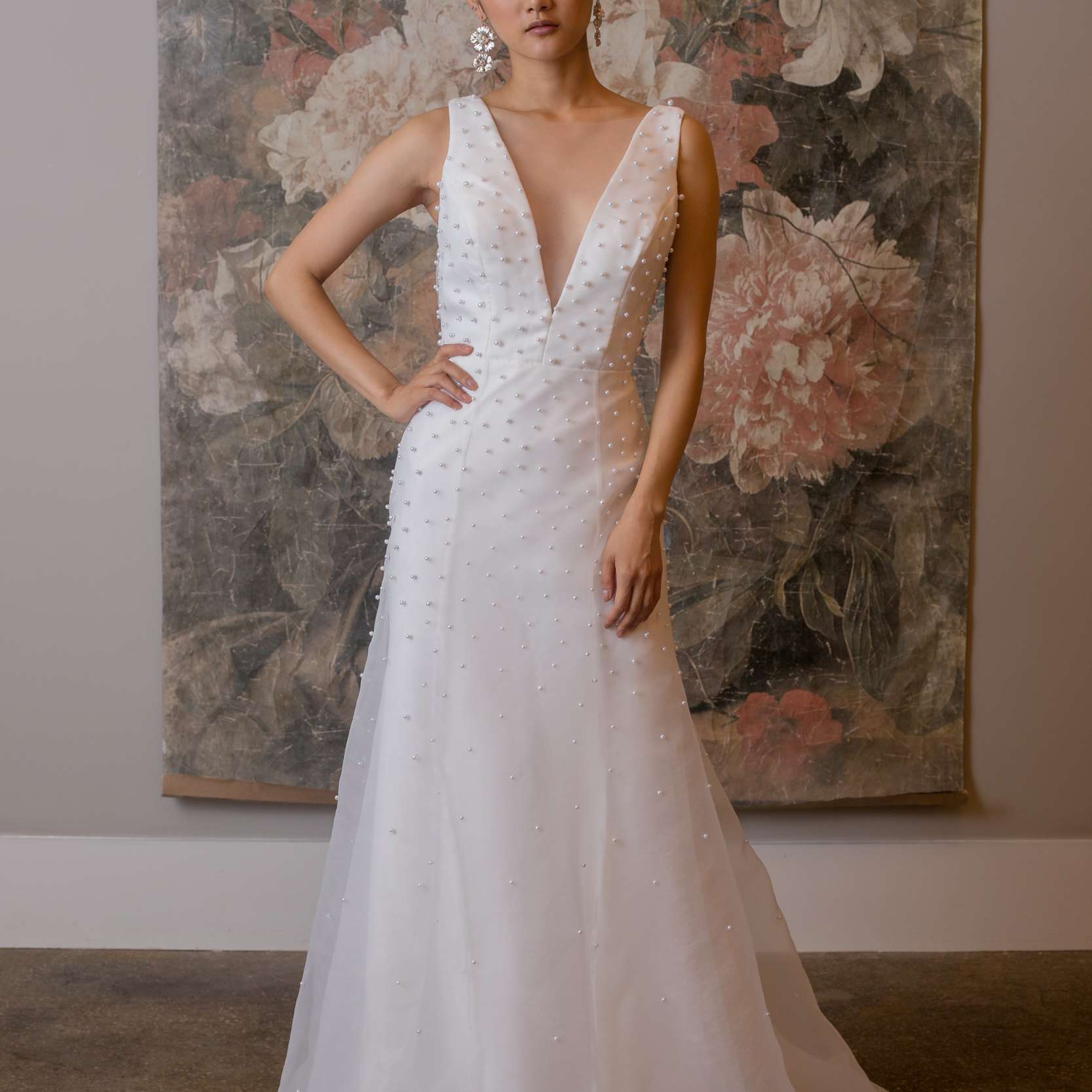 由Nouvelle Amsale设计的“Danielle”v领婚纱,镶花紧身胸衣和薄纱裙。