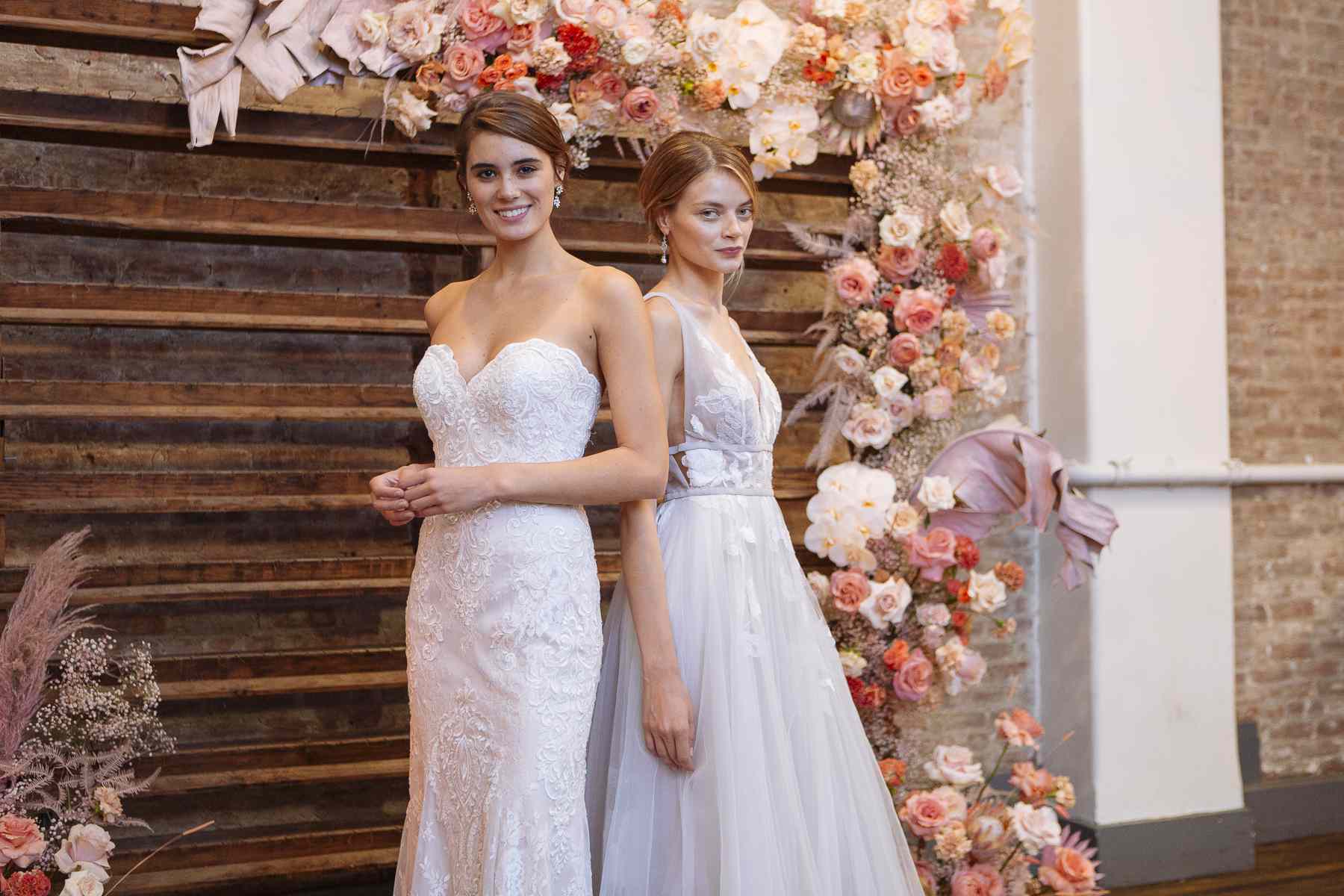 由Wtoo by Watters设计的带有花卉刺绣和亮片的“Lizbeth”薄纱婚纱。