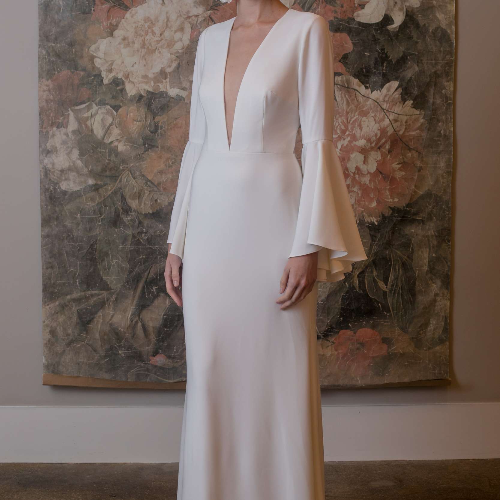 由Nouvelle Amsale设计的“Dimanche”绉纱紧身婚纱,背部有梦幻蕾丝和覆盖的纽扣。