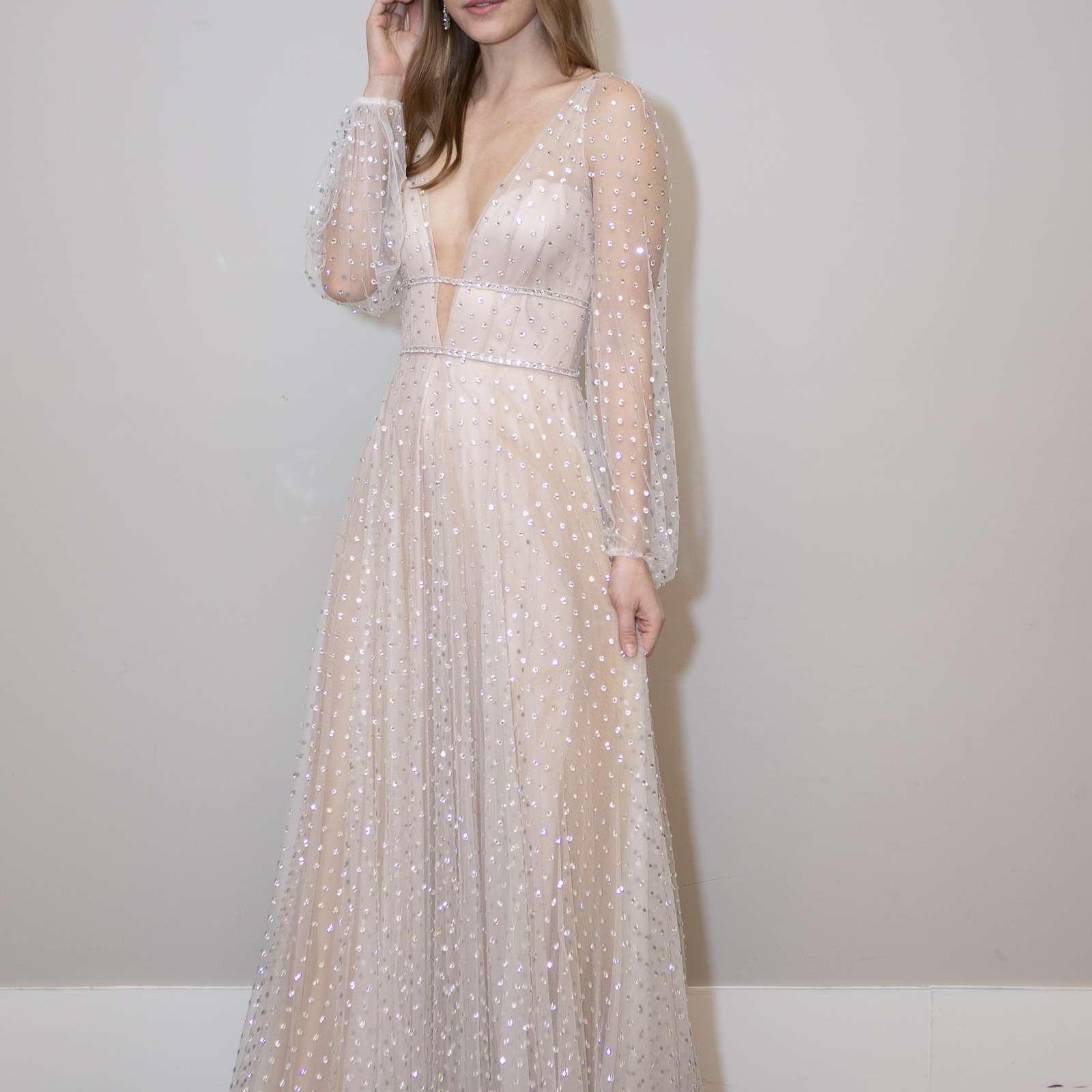 由Wtoo by Watters设计的“海明威”欧根纱礼服,饰有珠子的紧身胸衣和垂领。