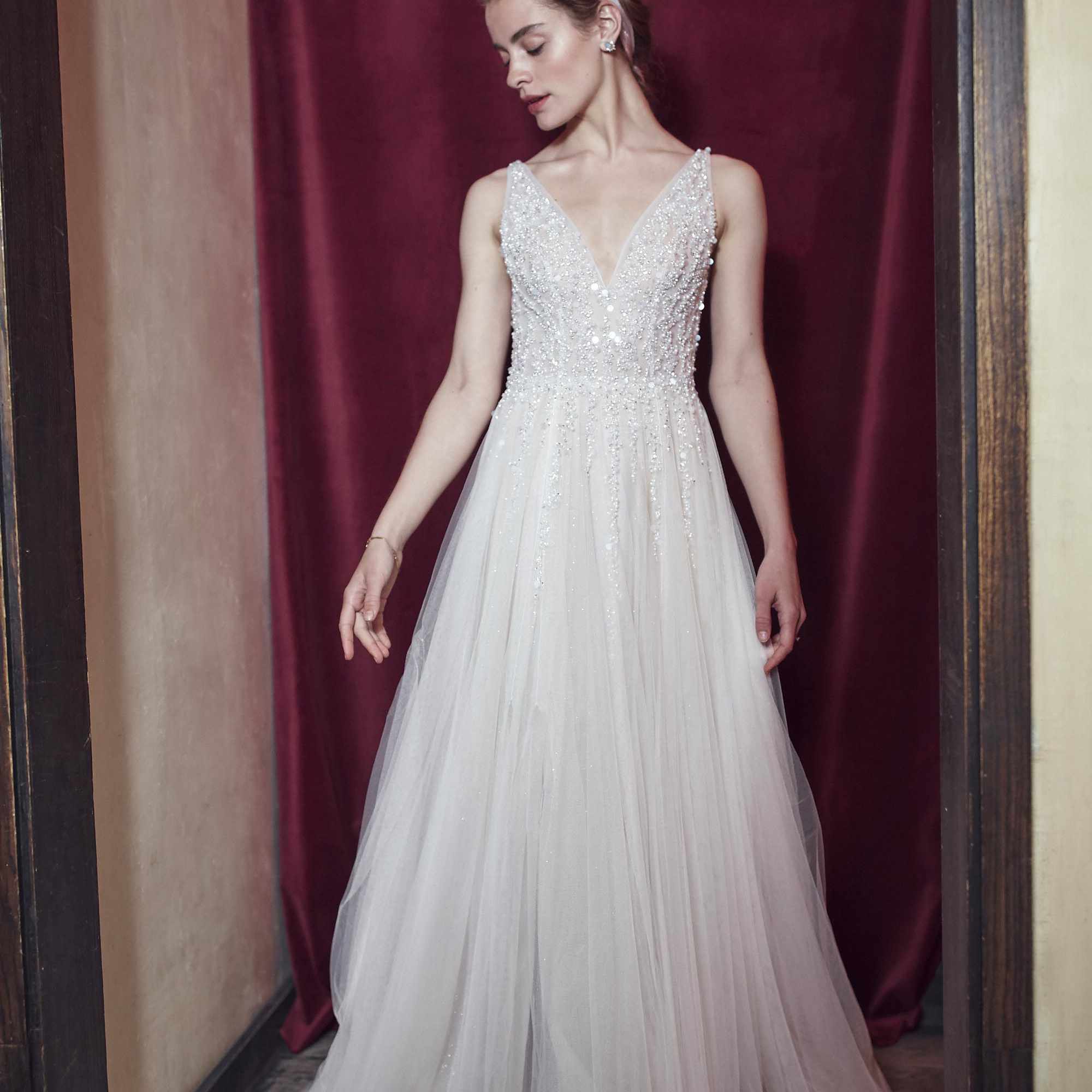 “登普西”薄纱列V领婚纱珍妮柳钉珠和刺绣珍妮。