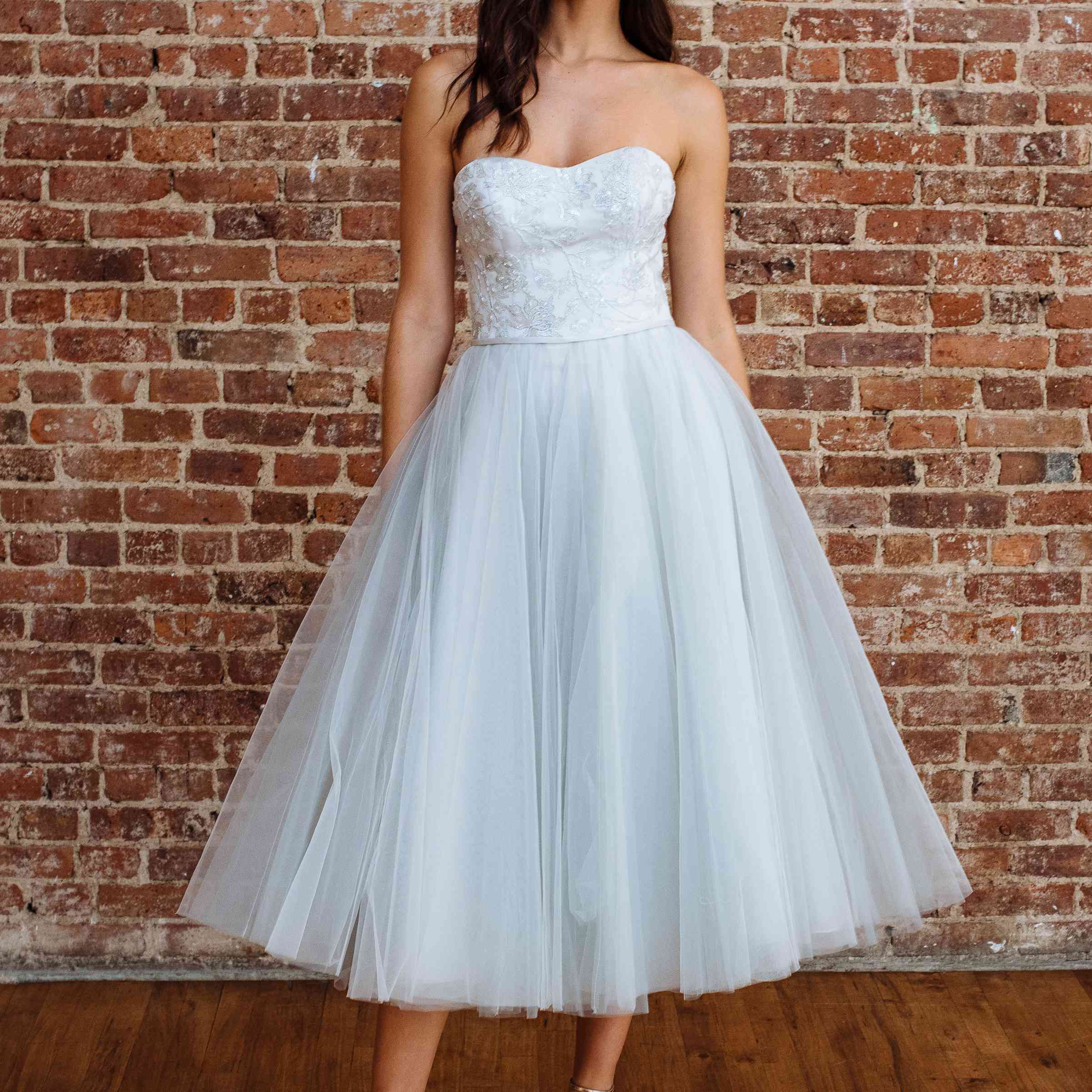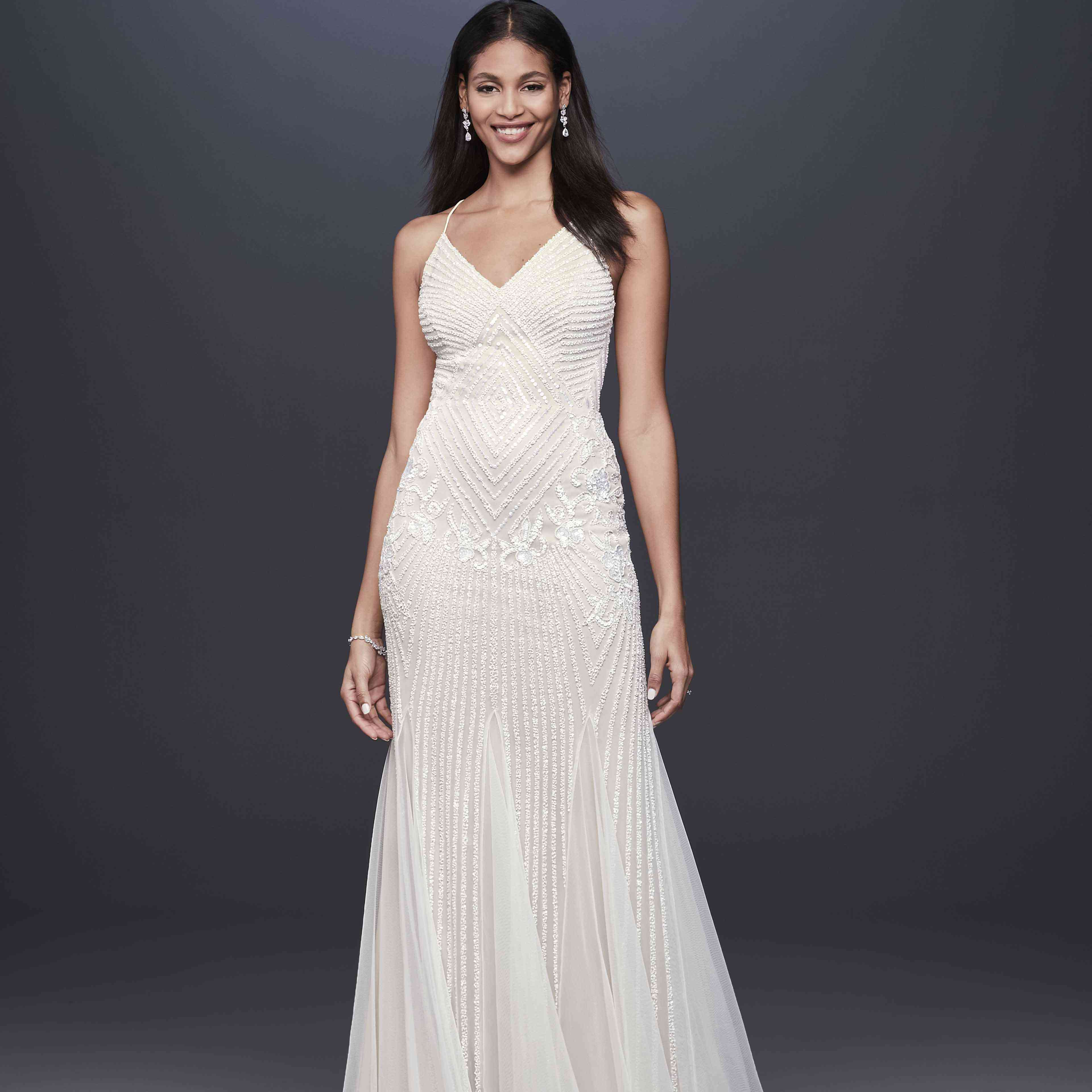 风格184599DB,及膝婚纱珠光宝气带和单套扑。