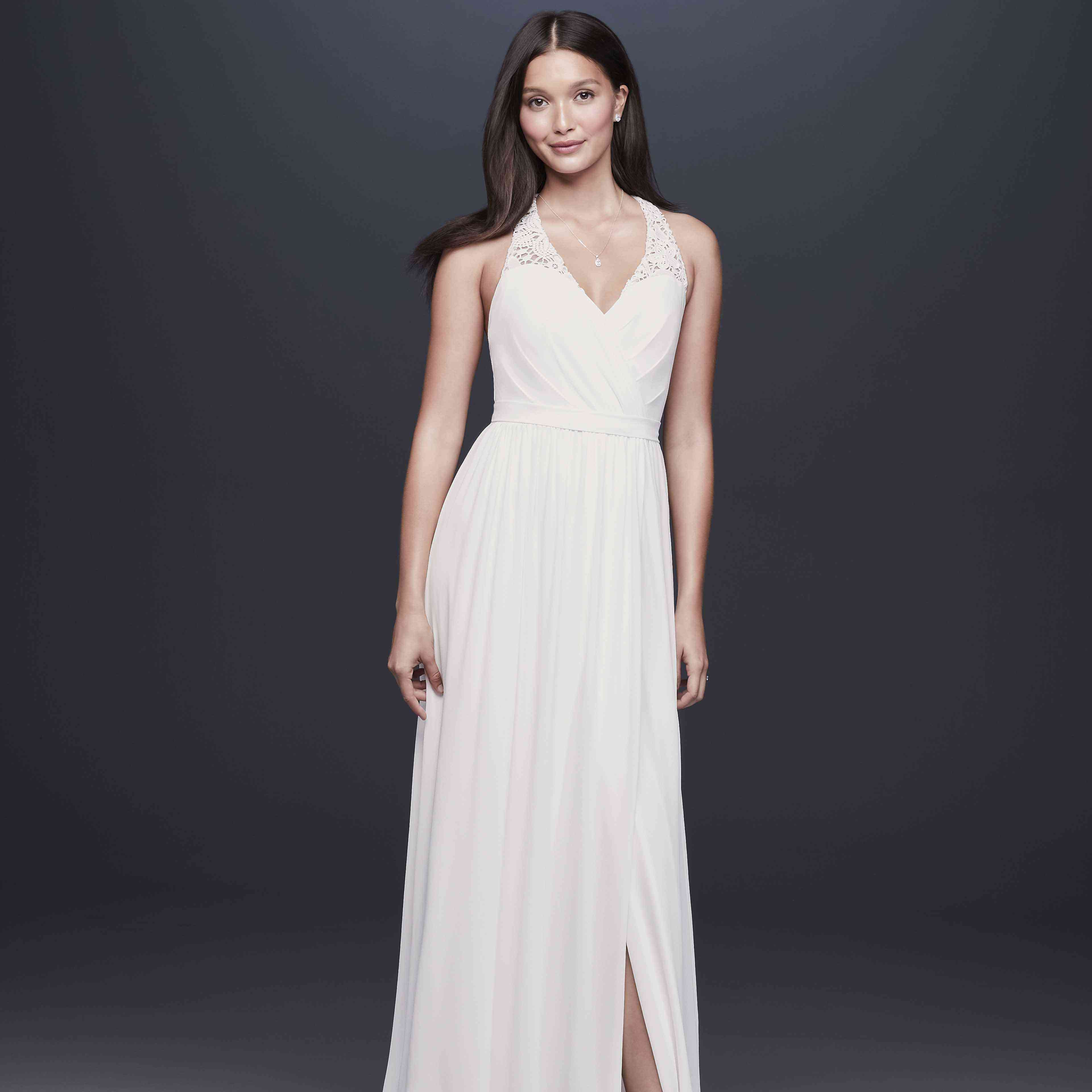 风格SDWG0827,白色薄纱地板长度裙缝隙。