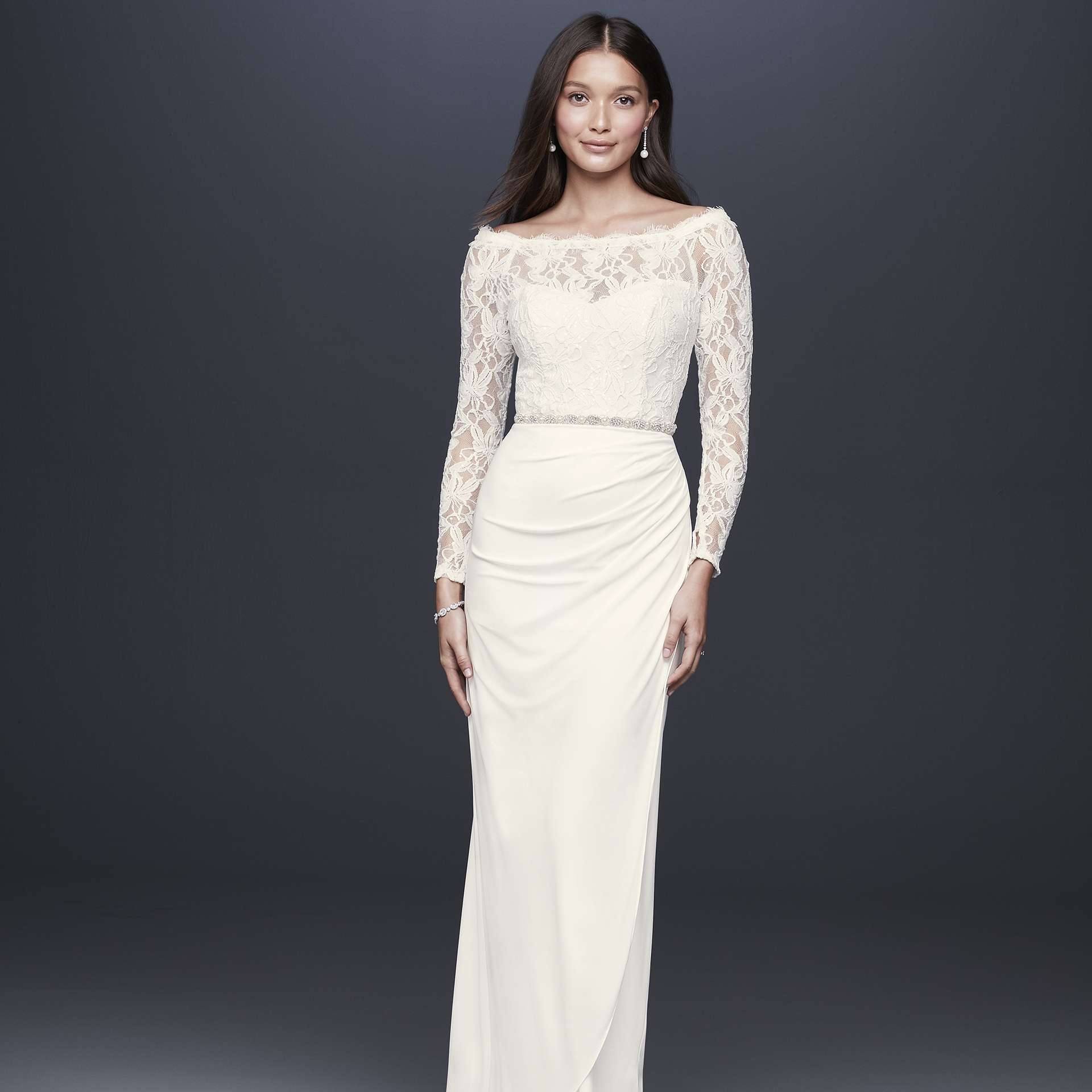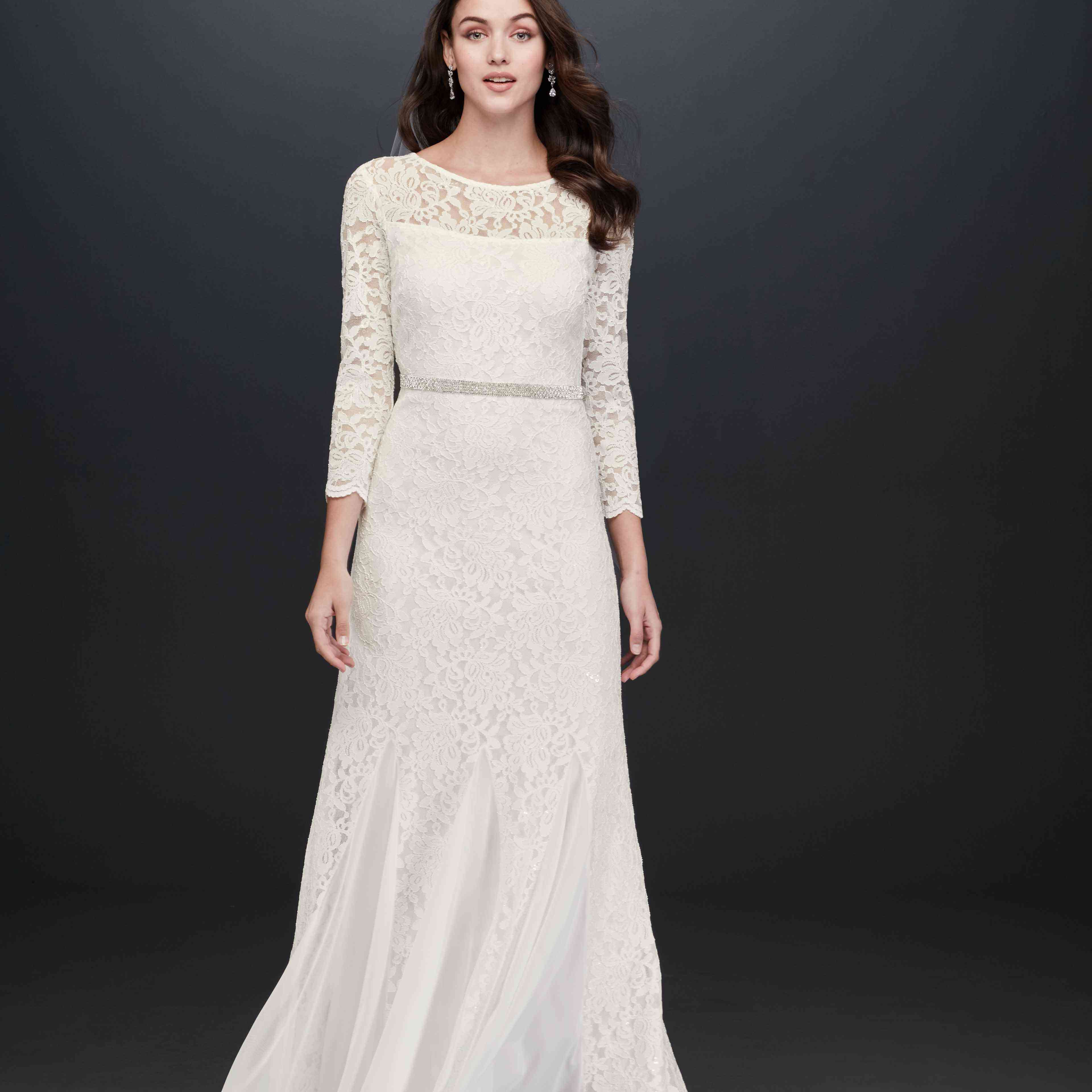 风格18467DB,蕾丝婚纱与磨损的袖子和缝隙。