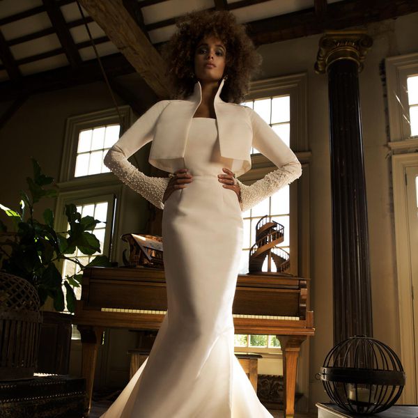 "If the past six months have taught us anything, it’s that simple is the name of the game—and fashion is no exception. But this minimal Alexandra Grecco sheath is given a dreamy upgrade thanks to long, sheer sleeves. The sparkling embroidery adds a little whimsy while the illusion material allows brides to show some skin. Plus, who doesn’t love a slit?"—Maggie Kreienberg, Associate Editor