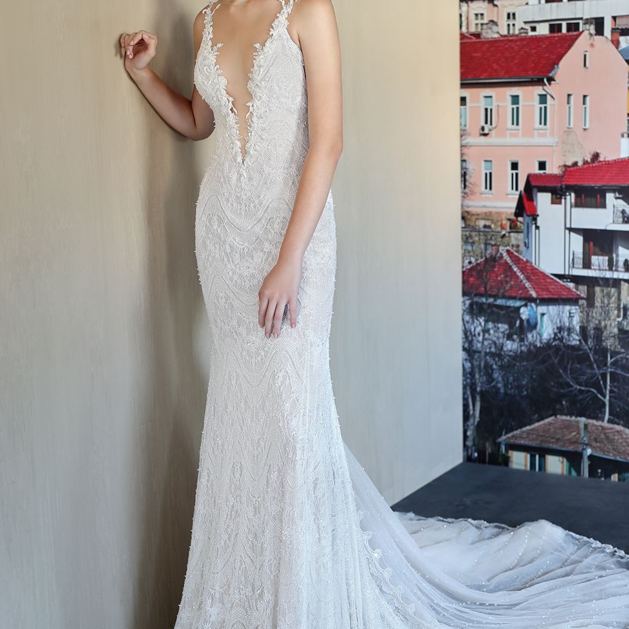 “塞丽娜”合身的美人鱼紧身婚纱与手绣花边。