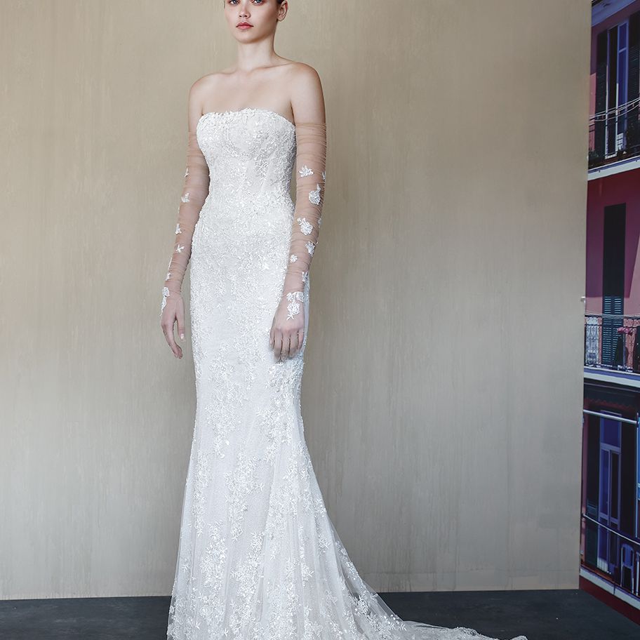 “Alba”无肩带珠绣婚纱与配套的薄纱手套。