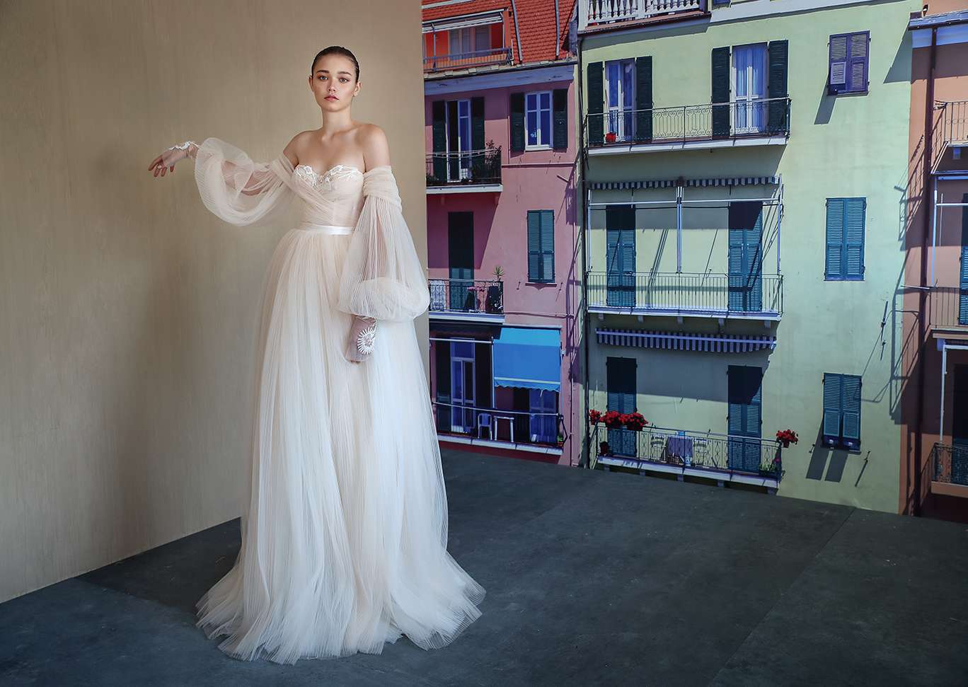 “贝丽娜”露肩丝绸薄纱婚纱,气球袖。