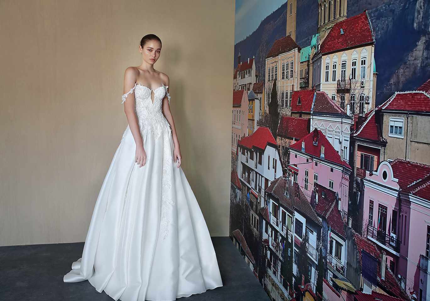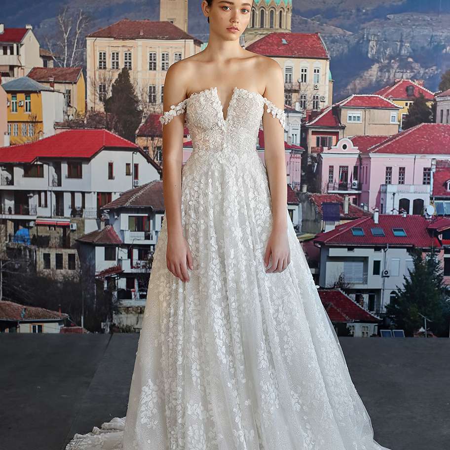 “Solange”露肩绣花蕾丝婚纱。