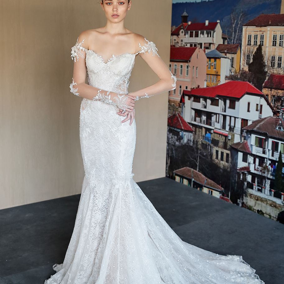“Nissa”露肩美人鱼婚纱与幻想袖,法国蕾丝和3D刺绣贴花口音。