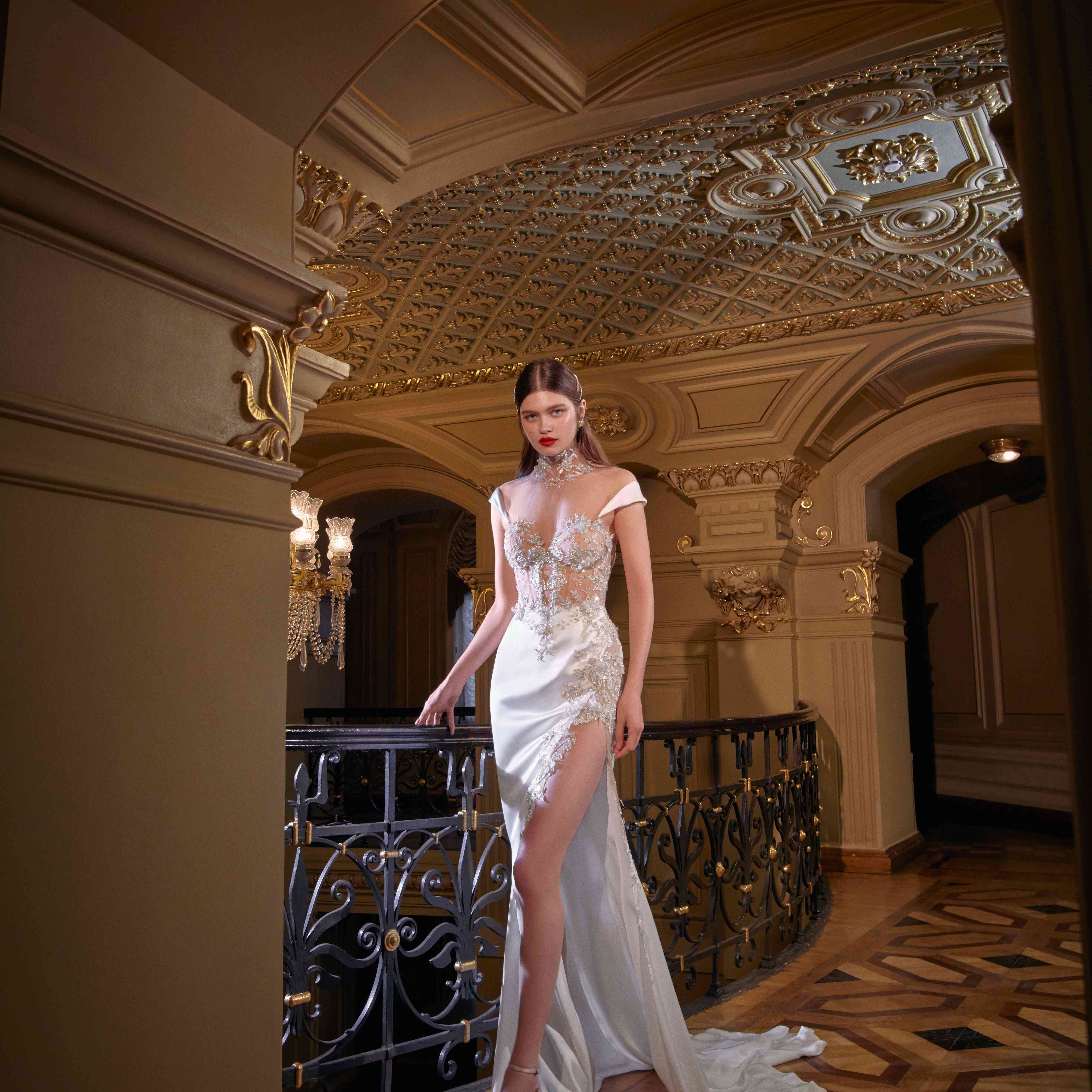 “米兰达”柱形婚纱由弹力绸缎制成,高领、紧身胸衣和开叉被垂下。