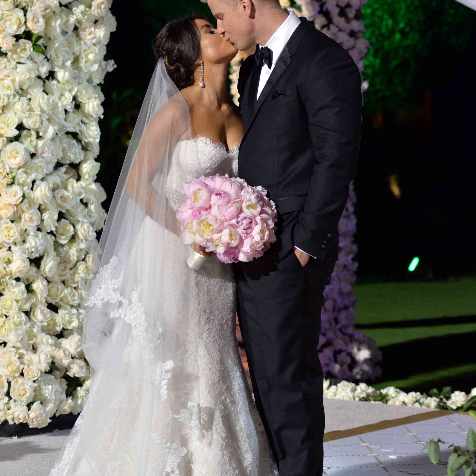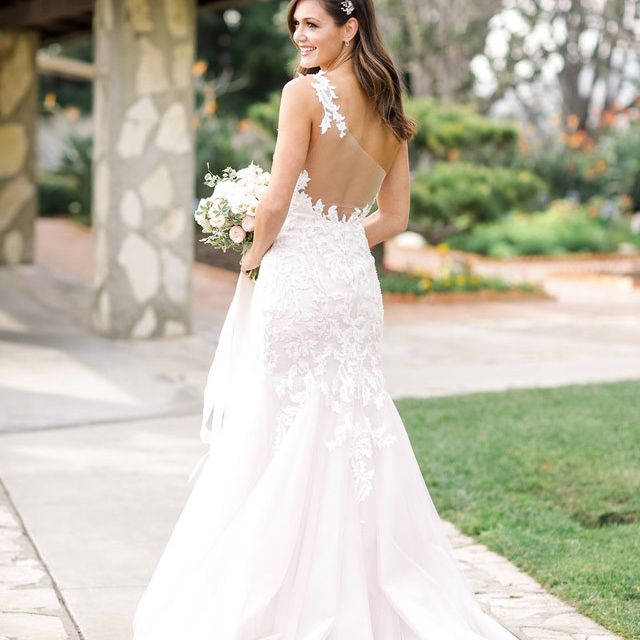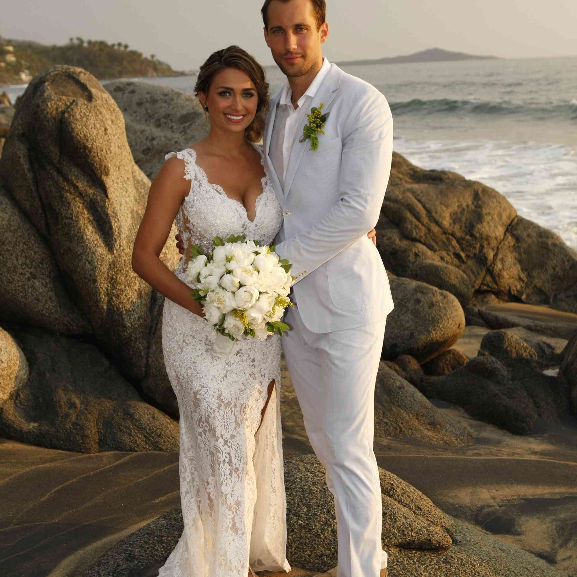 卡莉·沃德尔和埃文低音回到Puerto Vallarta,墨西哥一年后,他们相识并订婚,海滩在2017年卡莉的夏天结婚选择以色列设计师伊詹科恩她的裸照贴合和耀斑白色刺绣和贴花礼服。她又把她的期待了与鱼尾辫和钻石耳环。
