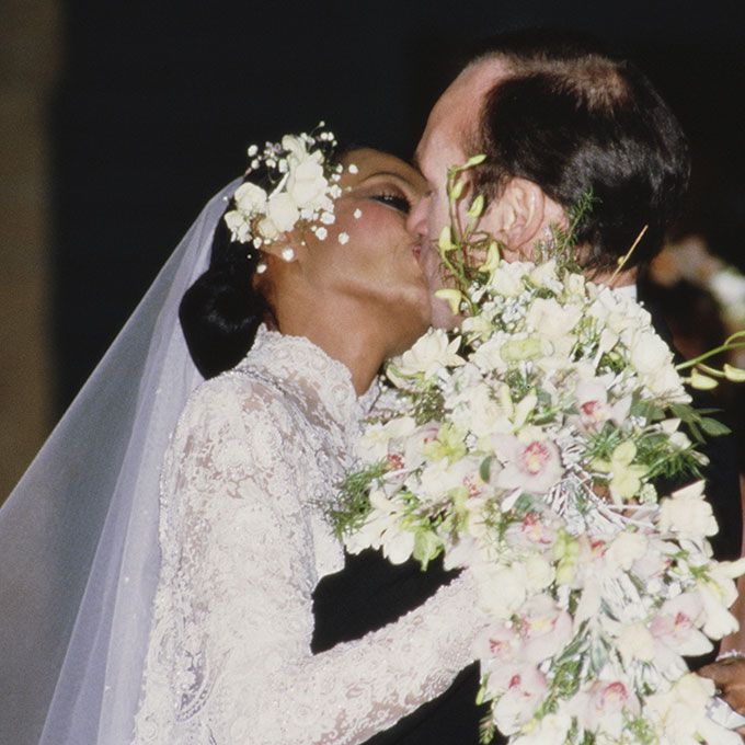 1986年,戴安娜·罗斯与小阿恩·奈斯结婚时身穿一件镶有比利时古董蕾丝的珍珠刺绣礼服。