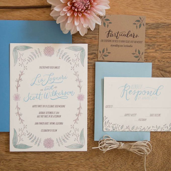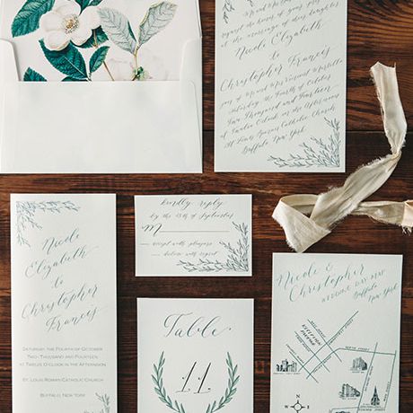 定制手工说明和美术字的邀请套房配有植物的细节,$ 450的邀请套房设计,拉根楼