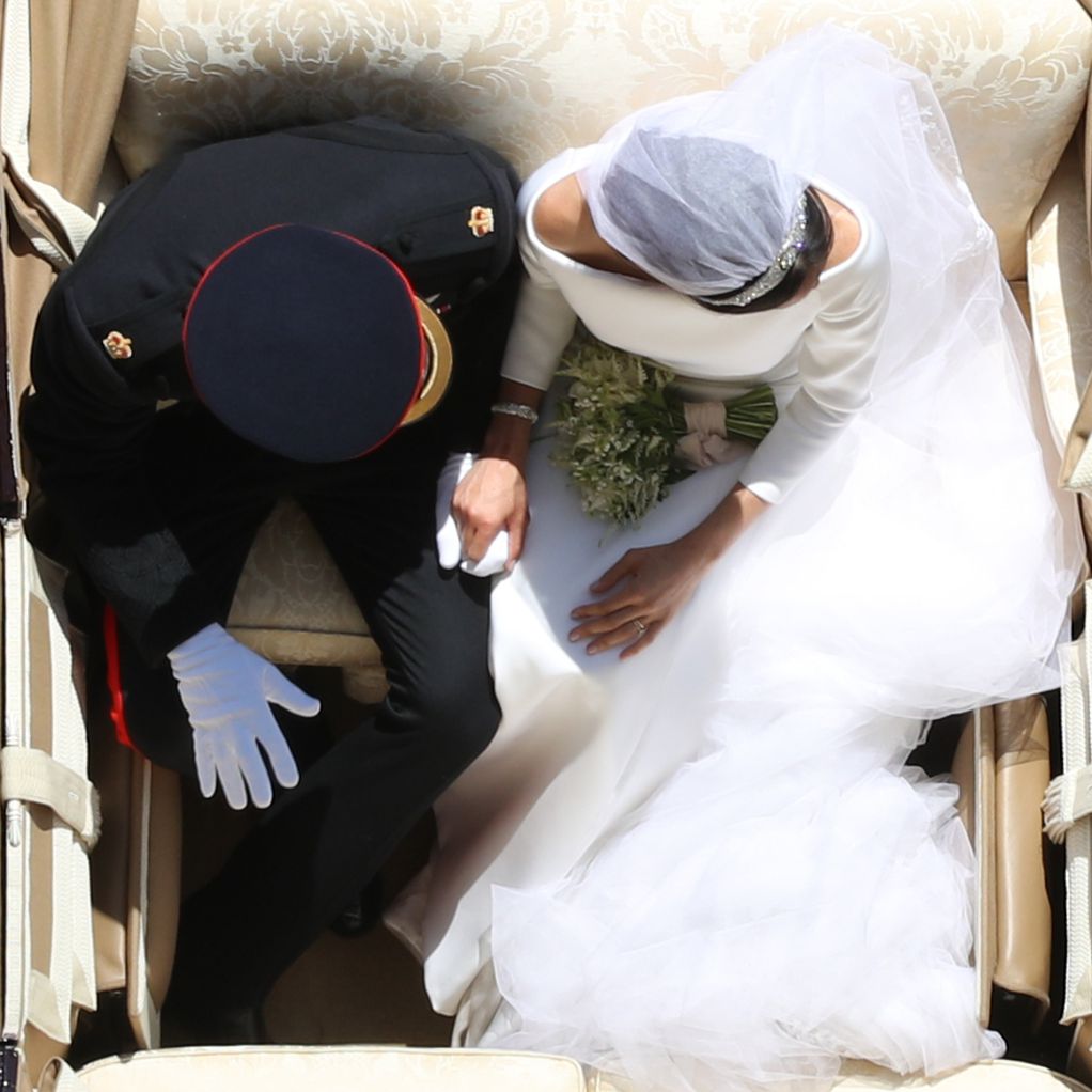 上帝救了这件衣服!在他们的第一个吻之后,哈里王子确保他的新娘没有旅行鉴于衣服当他们走下婚礼场地的楼梯时,所有的笑容。