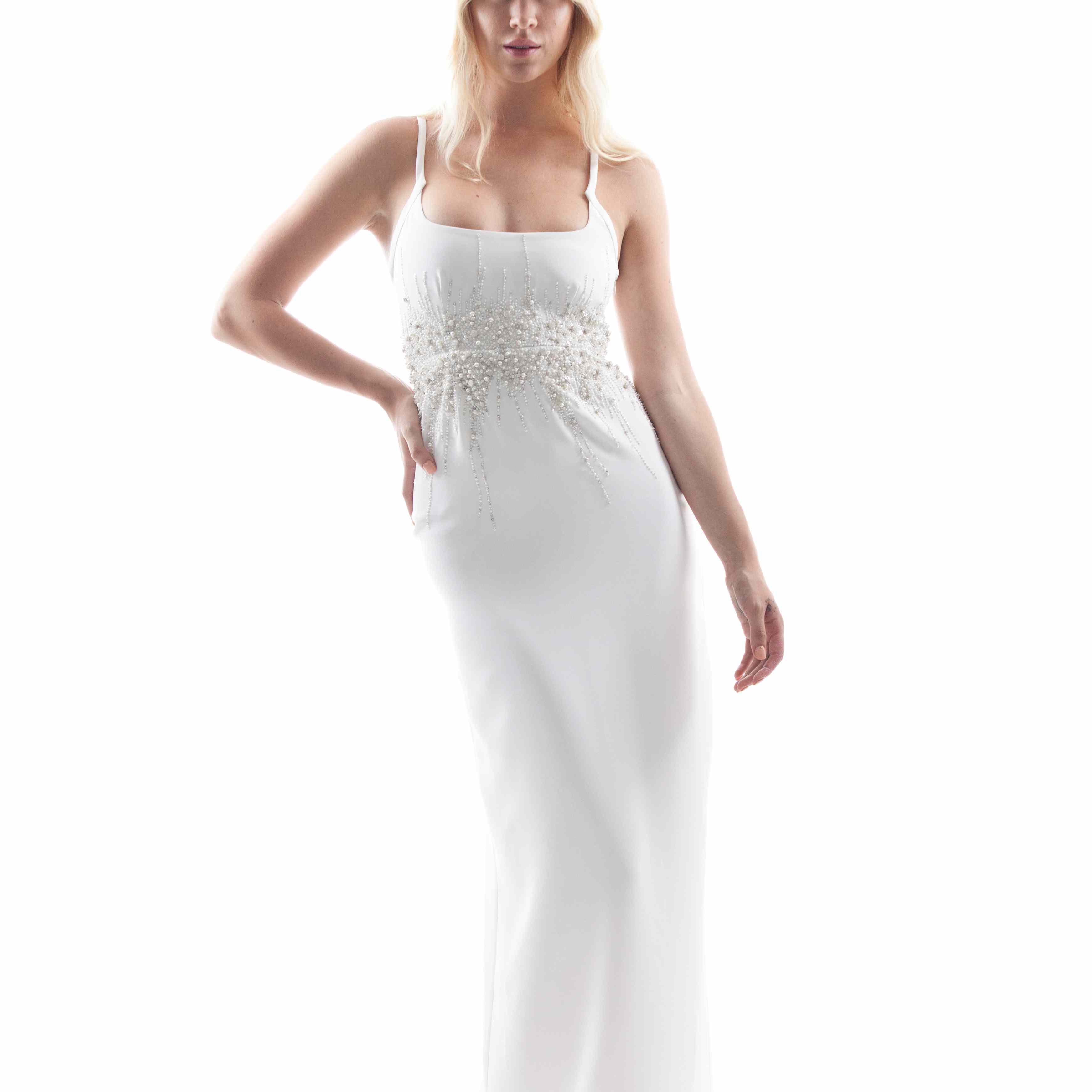 “劳拉”缺口肩带开领柱礼服在丝绸绉与手绣银星,混合珍珠,珠子和薄纱包裹晶体在腰部by霍顿。