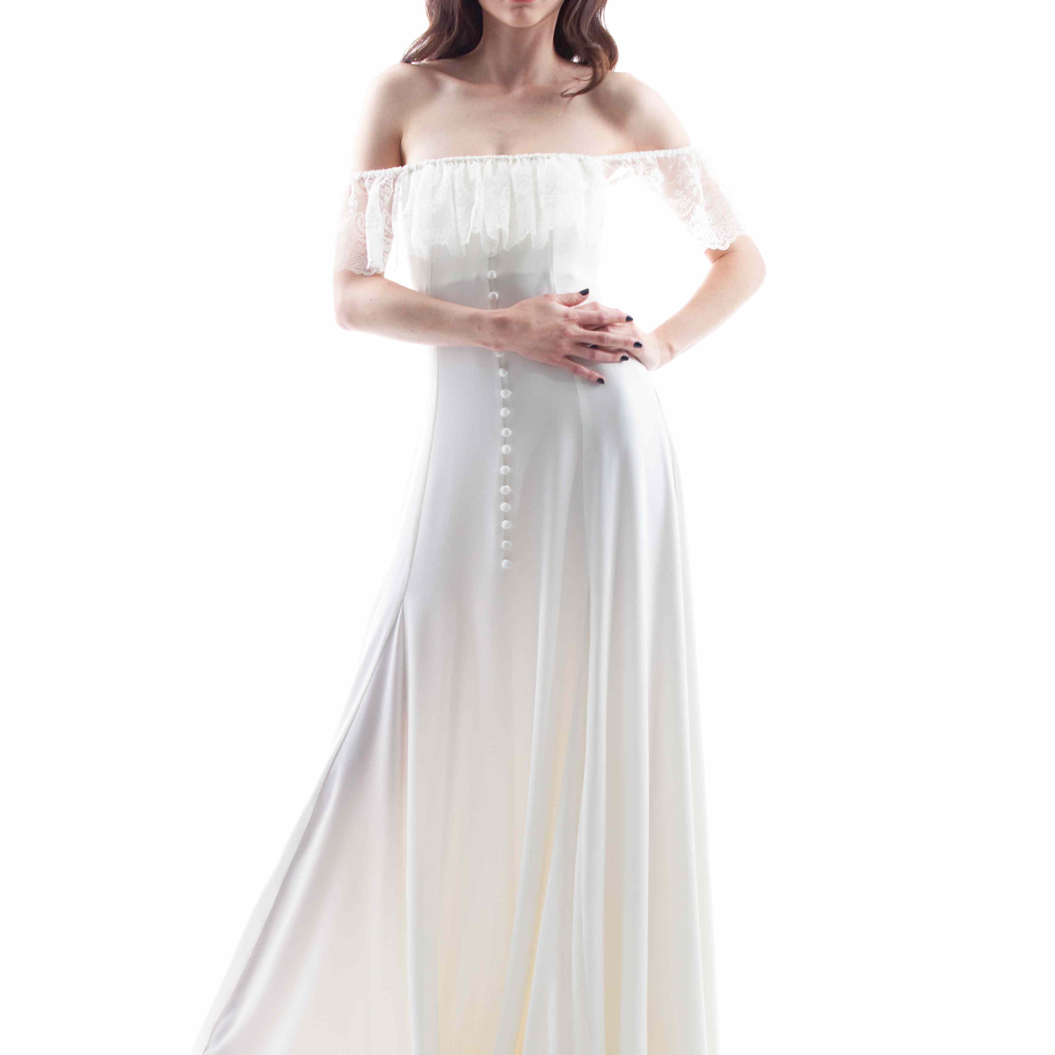“桑迪”露肩礼服,弹力丝乔其纱与尚蒂伊蕾丝褶边,覆盖钮扣和与斜纹的长裙霍顿。
