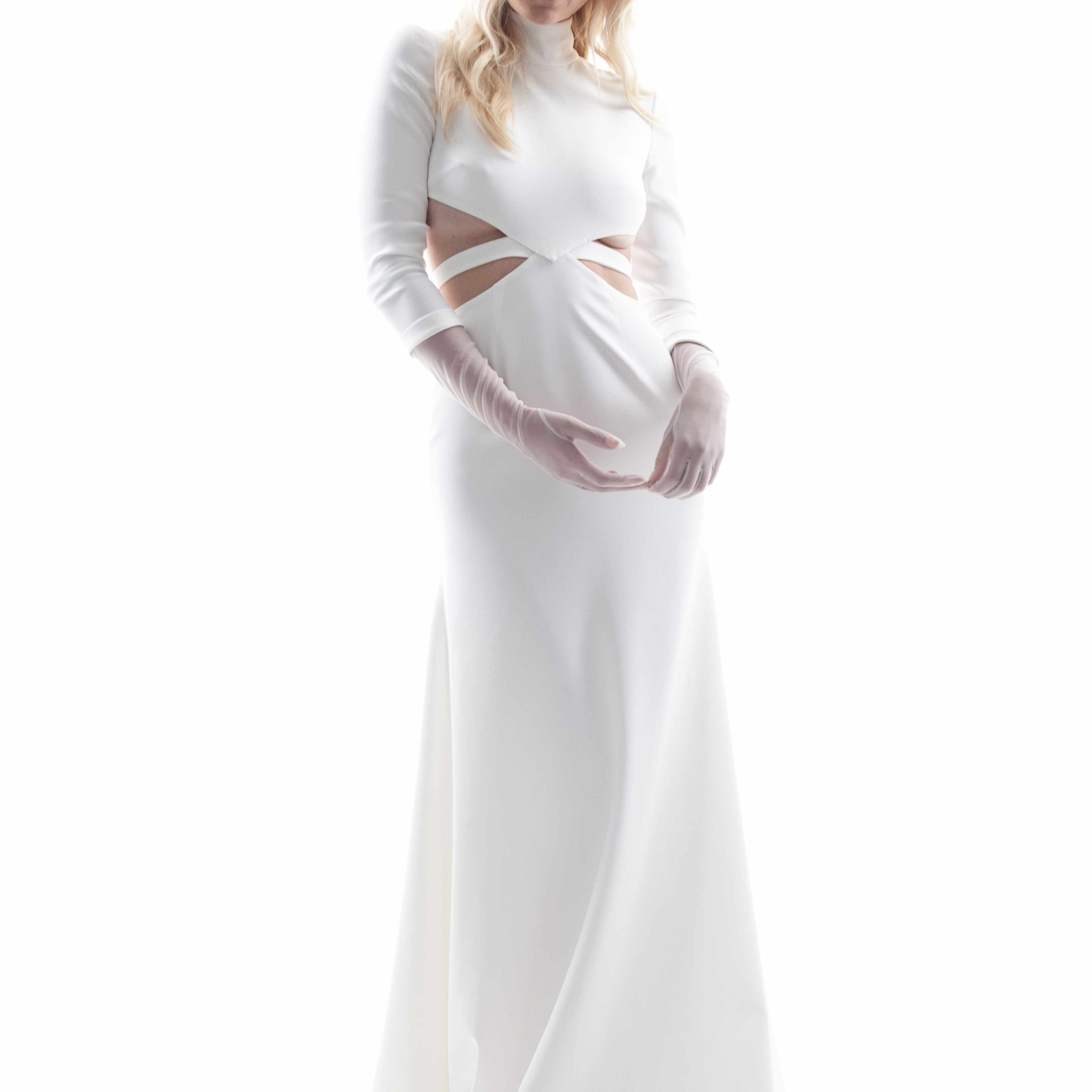“冬青”3/4袖高领礼服在丝绸绉边裁剪,腰带和敞开的背后宽马毛边;象牙薄纱歌剧手套霍顿。