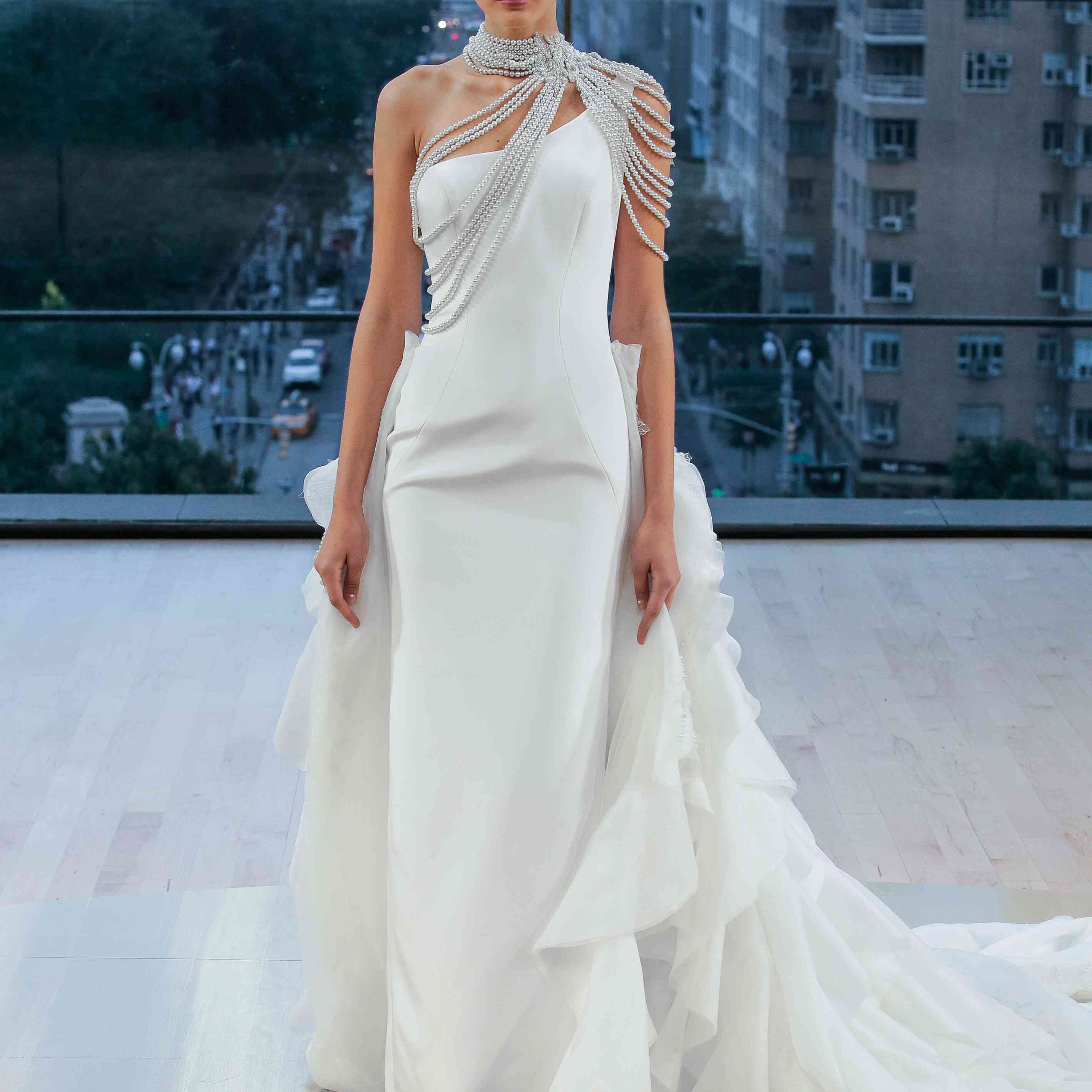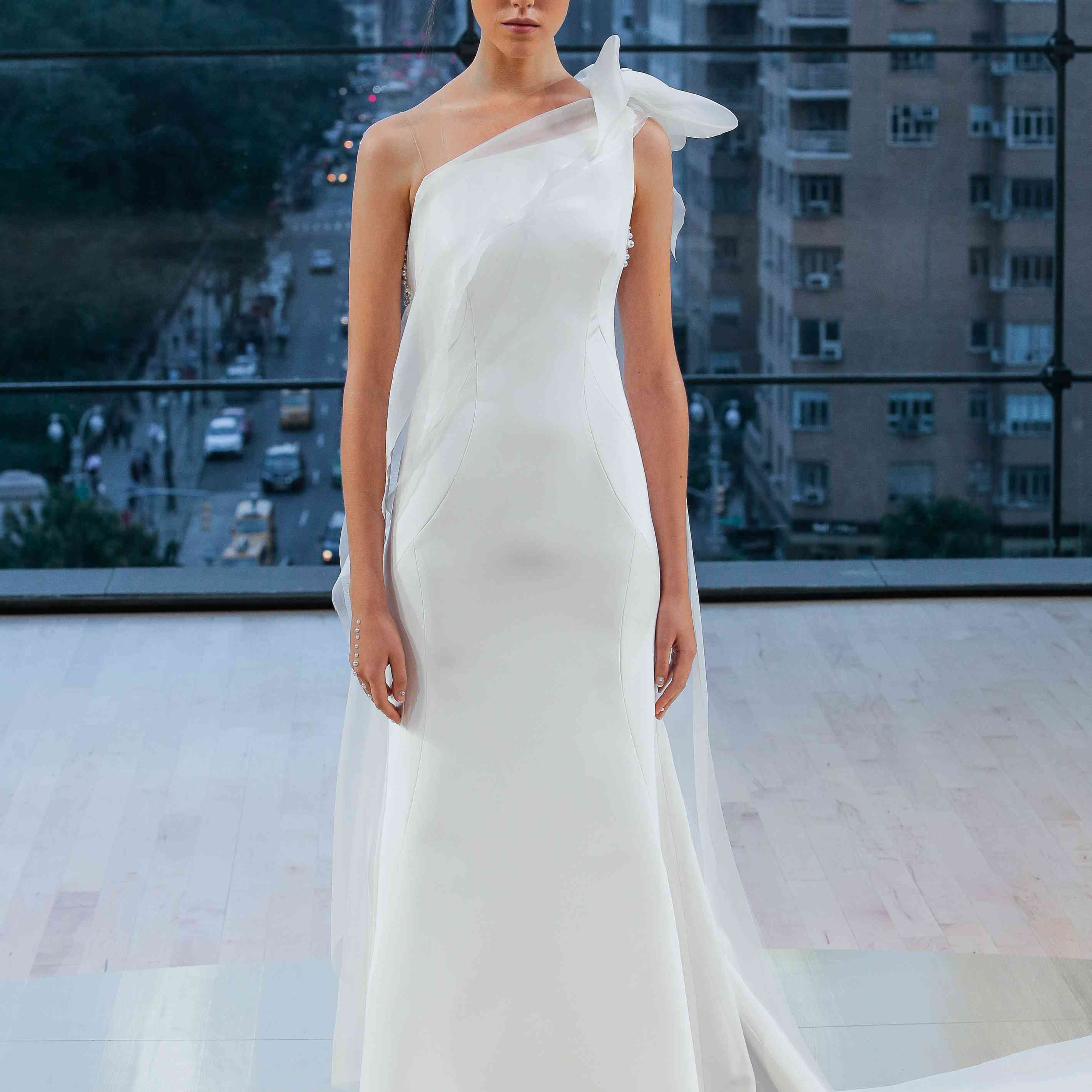 “Mercer”单肩紧身婚纱配透明硬纱蝴蝶结披肩,伊内斯迪桑托