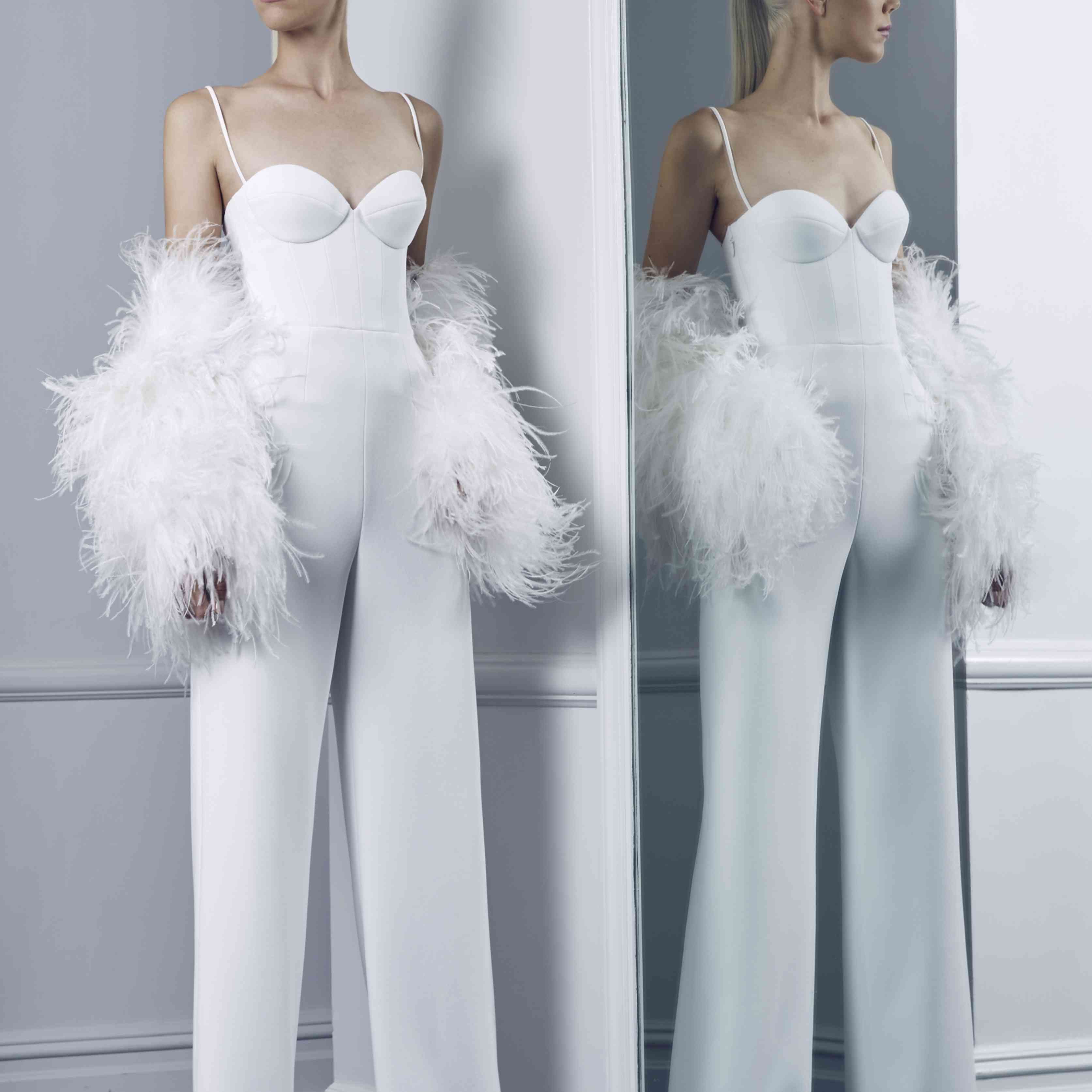 RK8480款式,珍珠弹力绉纱连身衣,胸衣配有意大利细面条肩带,并配有Marabou羽毛夹克,浮动的自然美态