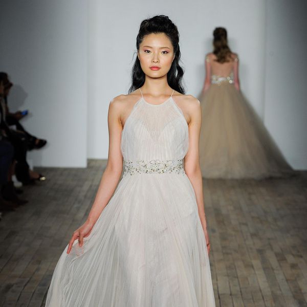 样式2753,象牙薄纱婚纱与经修饰的A线轮廓,串珠贴花,一个阿朗松花边胸衣与小舟错觉领口裸露甜心衬底,一个纯粹的V形背部,教堂列车,由塔拉基利