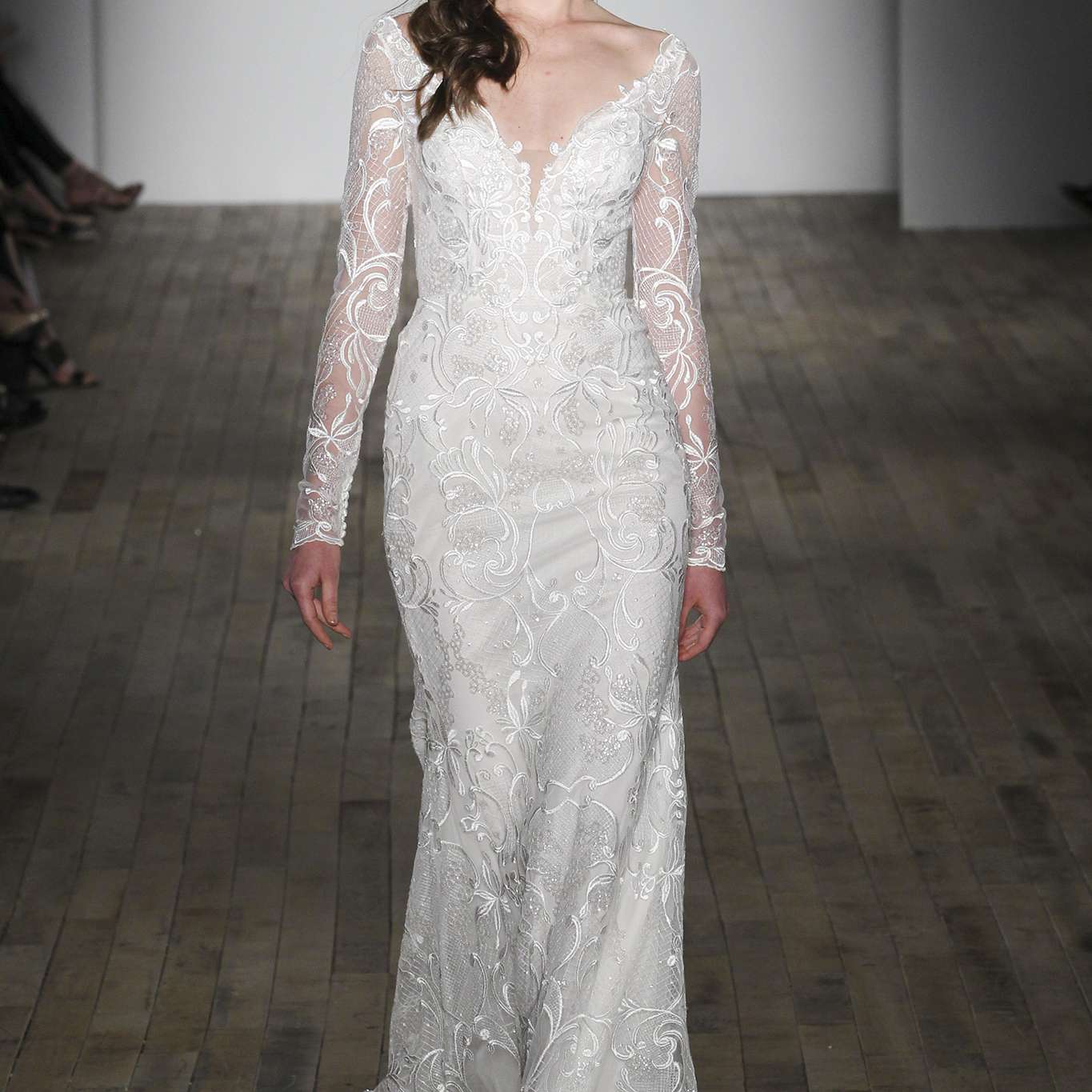 样式2756,象牙改性鞘婚纱亮片刺绣花边,深切入领口与尖的的肩长错觉袖,高剪切背部,和一个扫列车,由塔拉基利
