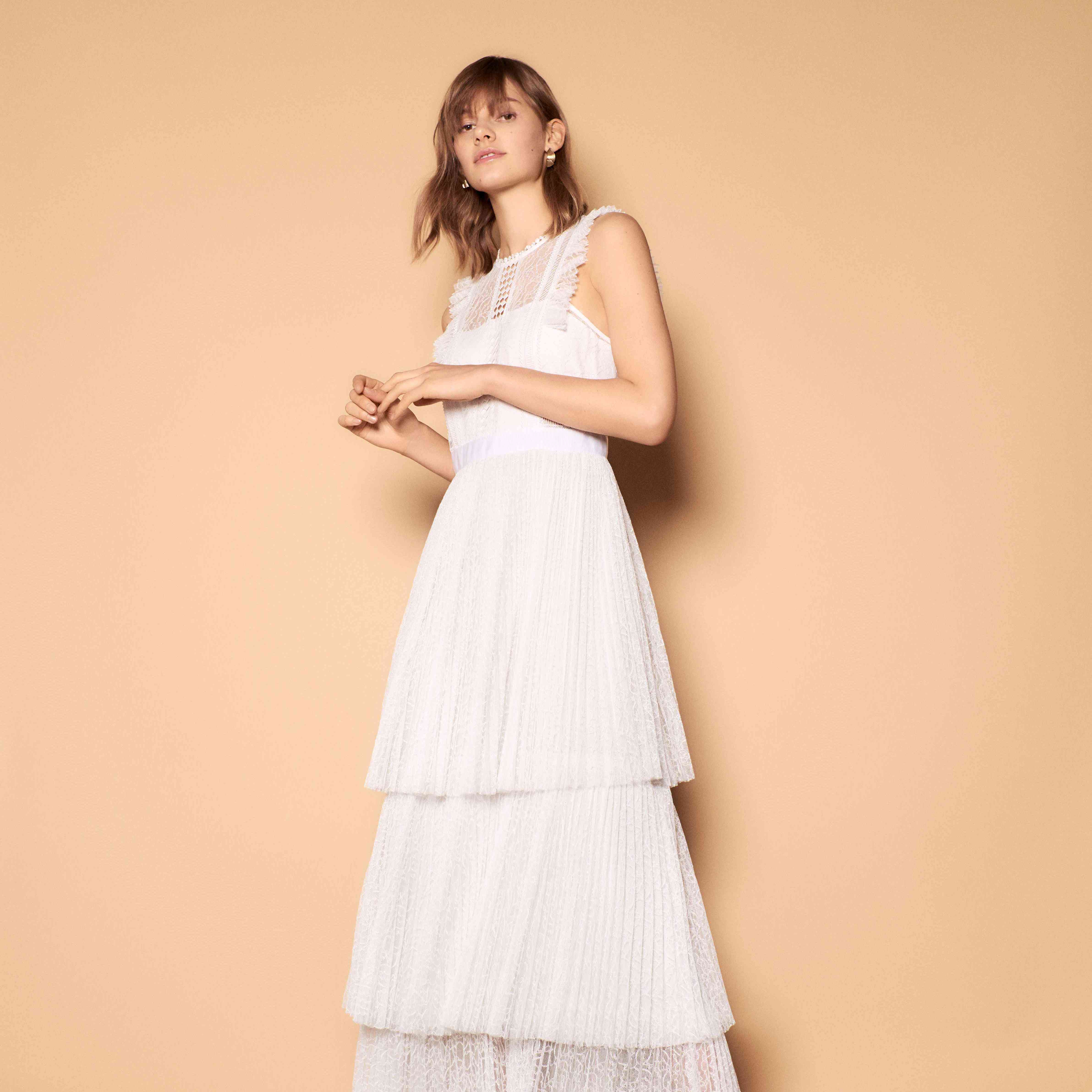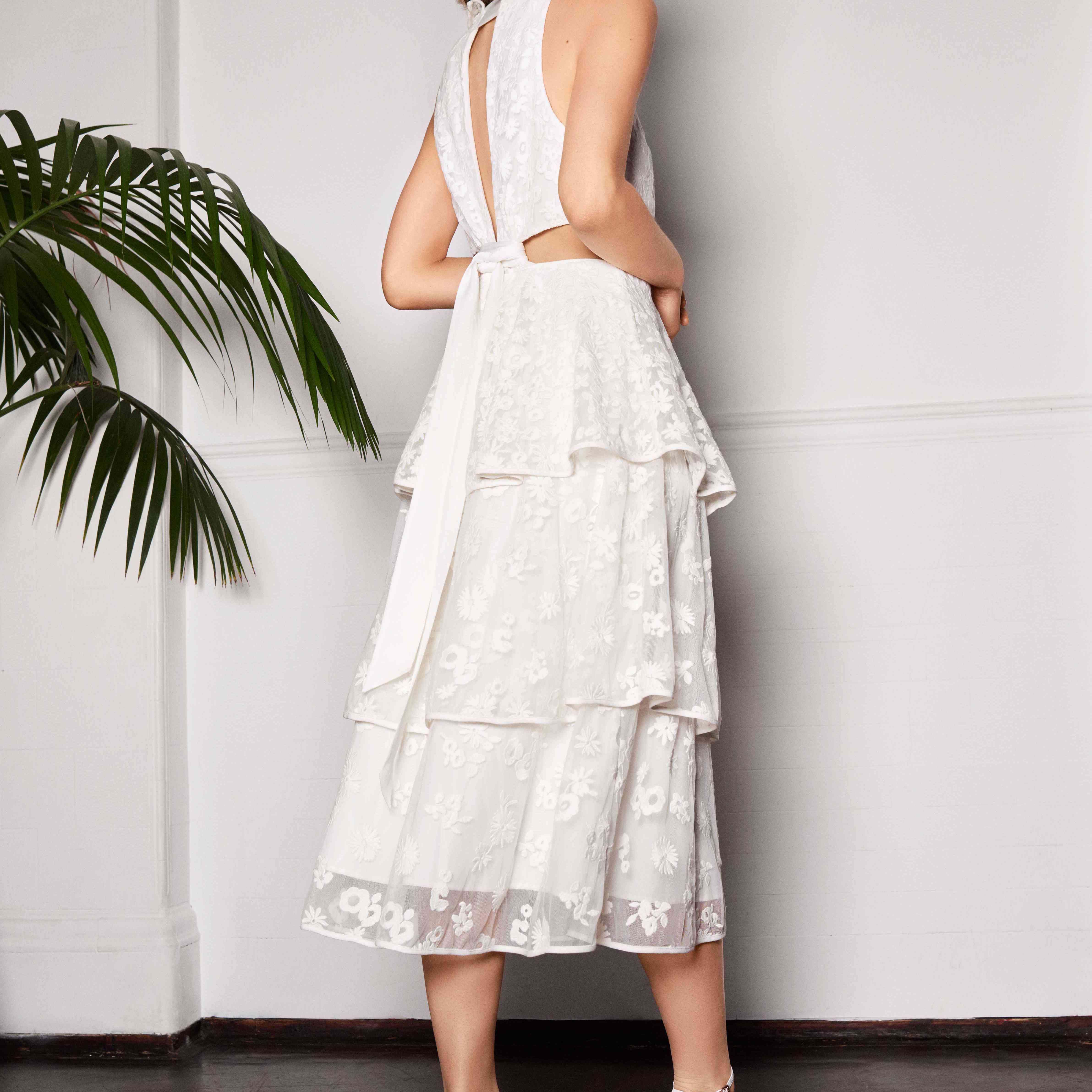 “桂尼维尔”长至茶点的婚礼礼服,棉质刺绣薄纱,分层裙,高褶边领口和下背部的裁剪细节,吹口哨