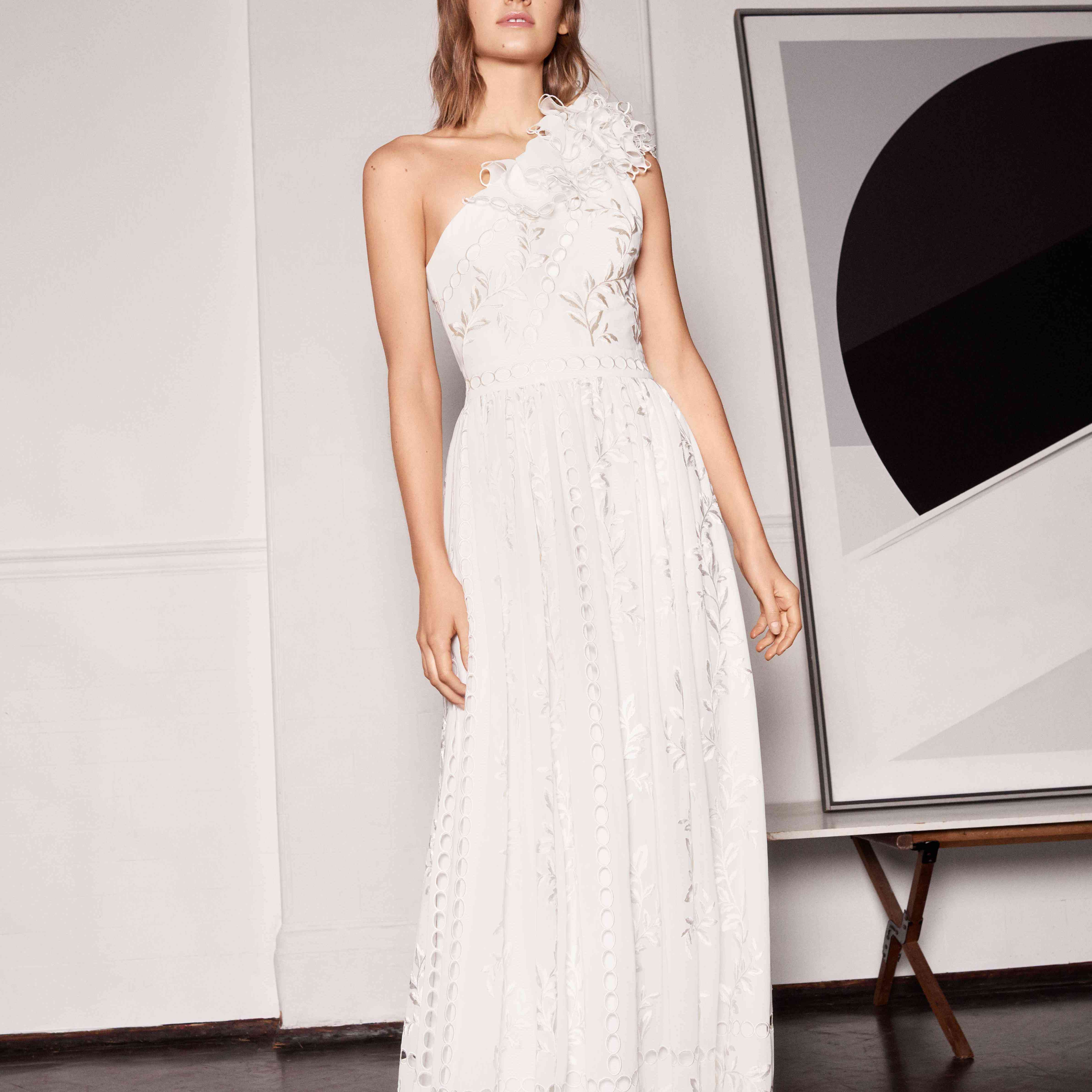 “贝森”单肩及踝伴娘礼服,吹口哨