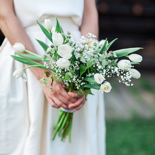 我们喜欢这位新娘保持着全白的传统,甚至连她的牡丹花束都是白色的。单色牡丹、海葵、玫瑰和小花蕾的混合,使整个布局看起来不太平坦。