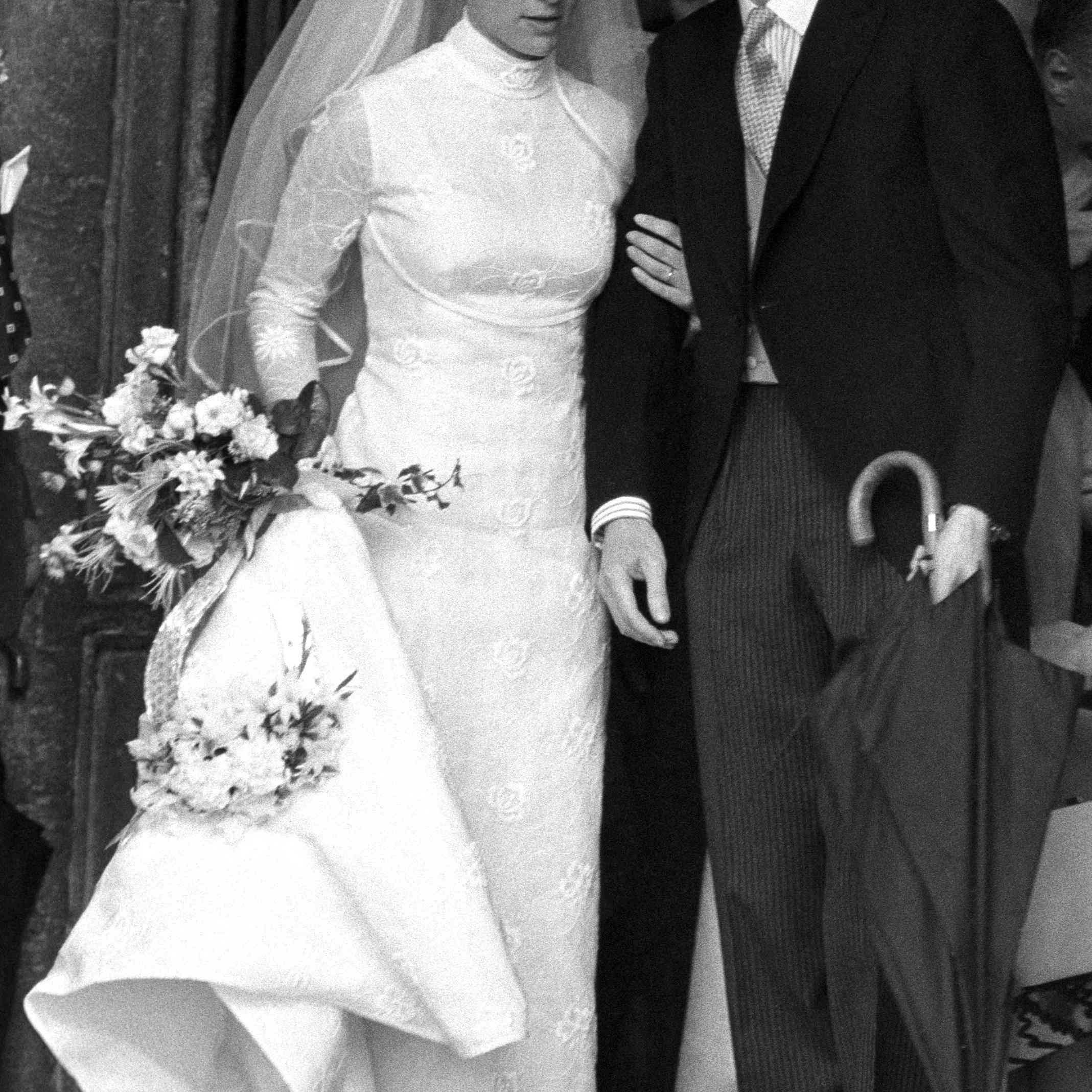 当结婚大卫·阿姆斯特朗 - 琼斯,玛格丽特公主和安东尼·阿姆斯特朗 - 琼斯的儿子,小威穿上精致莲花头饰这是在1959年送给她的母亲在法律由她的母亲。