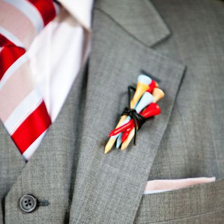 如果你的新郎是个高尔夫爱好者,那就把几件色彩鲜艳的木制t恤绑在一起,作为他夹克上的运动装饰。