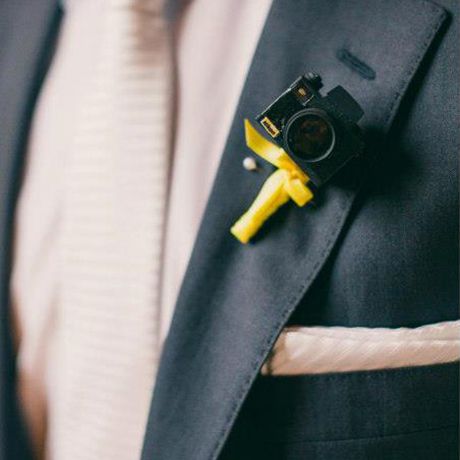 你的新郎是个有才华的摄影迷吗?给他一个惊喜与定制的钮扣Fritts罗斯诺夫这显示了他最喜欢的爱好。