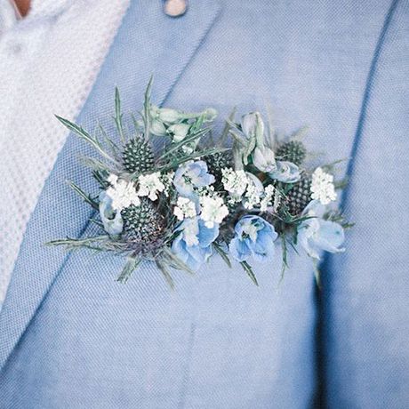 一个完全由新鲜花朵制成的口袋方巾,像这个充满蓟和飞燕草的设计花说是一个完全独特的,别致的方式来装饰他的婚礼日装扮。
