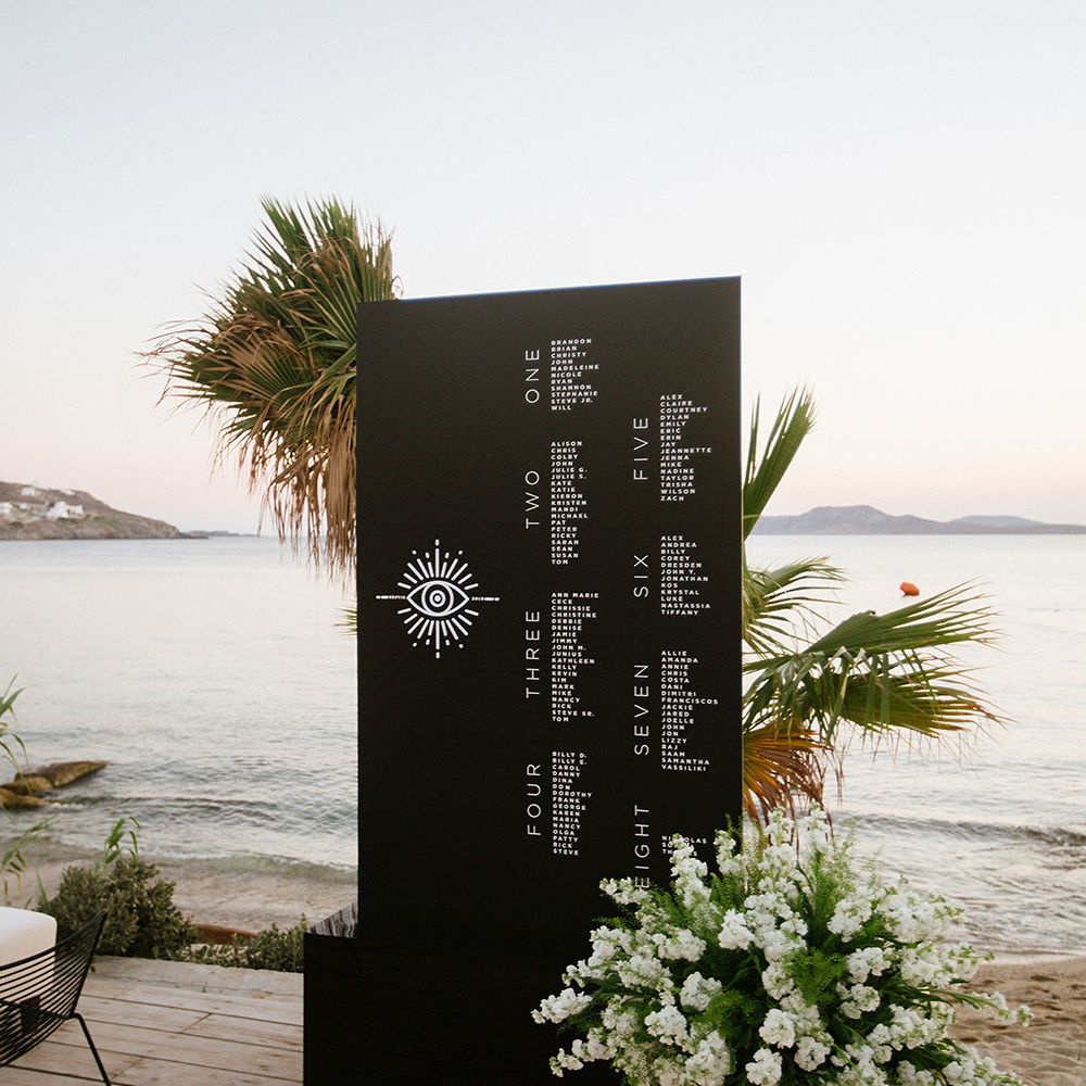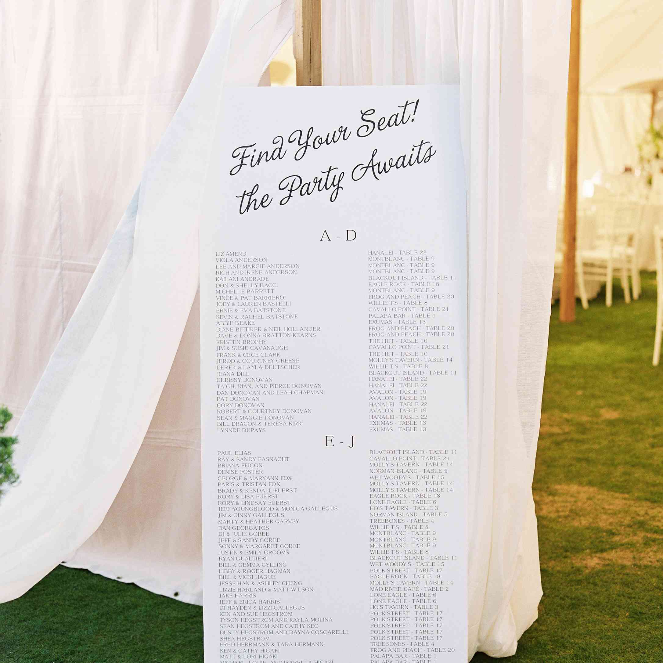“我们想要一个引人注目的晚餐帐篷入口,”Coastside Couture的共同所有人海蒂·休格特(Heidi Hughett)说。迎接客人的是点缀着绿色植物的香槟架子和写着“啜饮并坐下”的标语。一旦他们选好了酒杯,“他们就会看一看入口处按字母顺序排列的六英尺高的黑白座位表,”休格特解释说。这种干净利落的展示展示了复杂和简单。