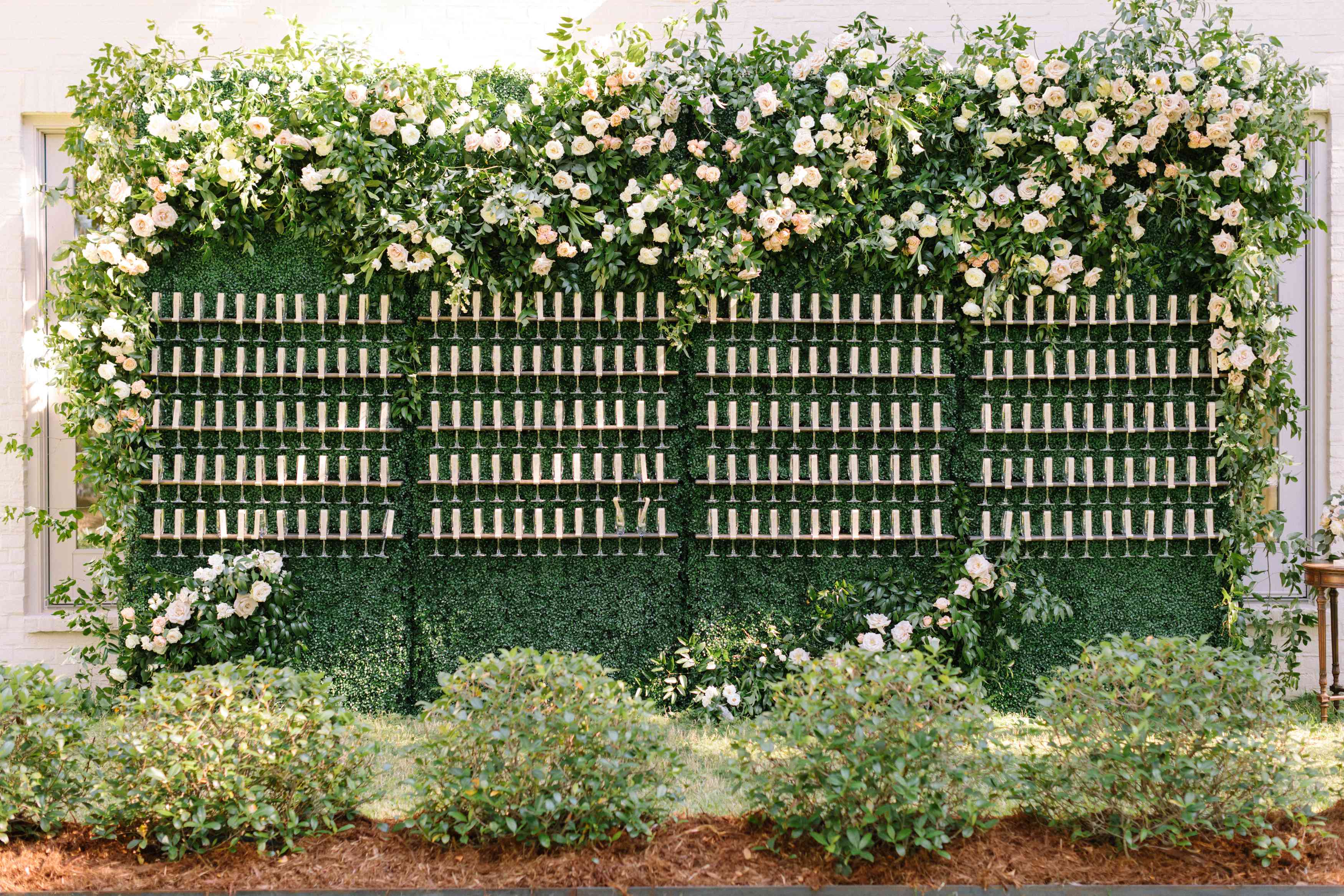在这个户外招待会上,白色的书法卡片被展示在一个覆盖着绿色植物的格子上。