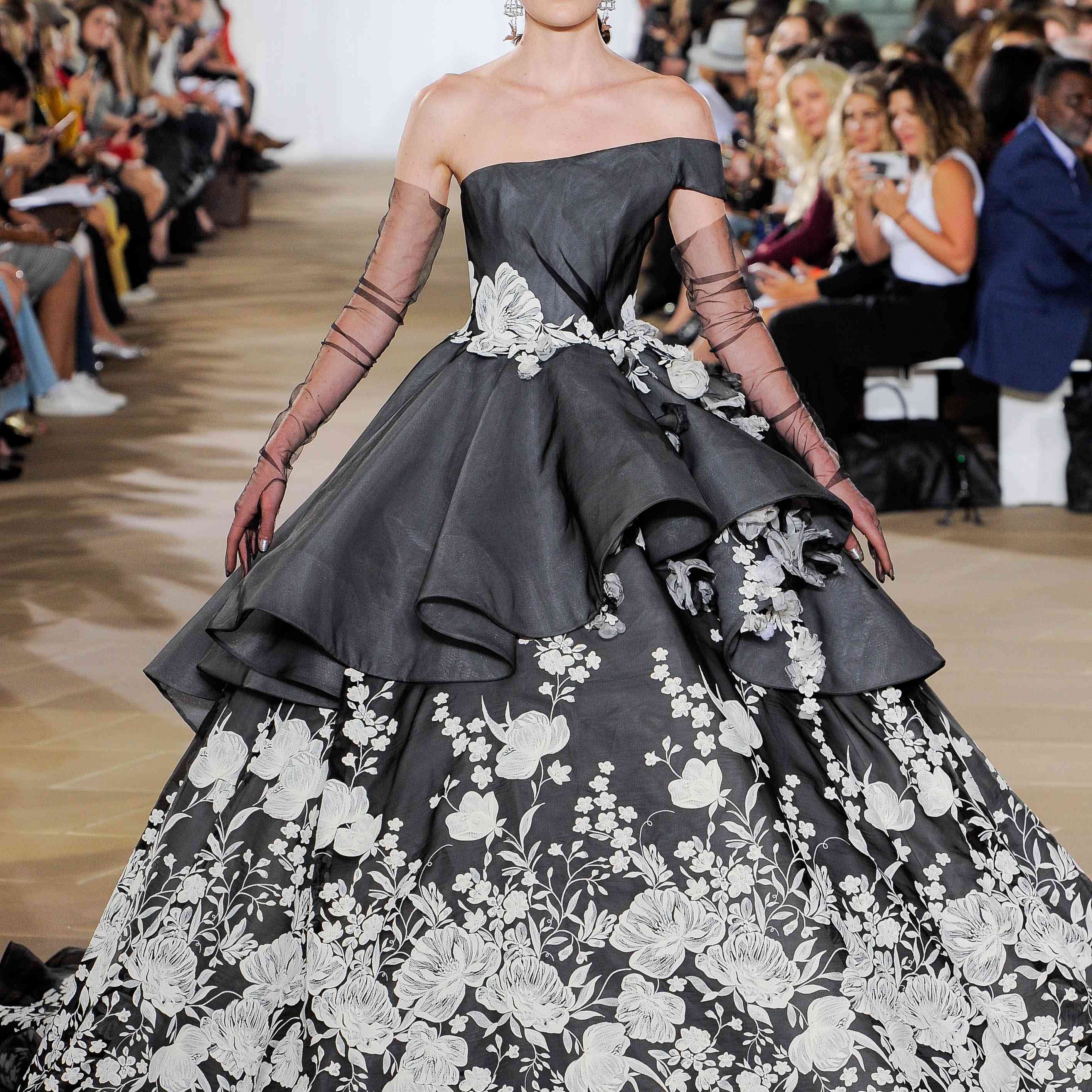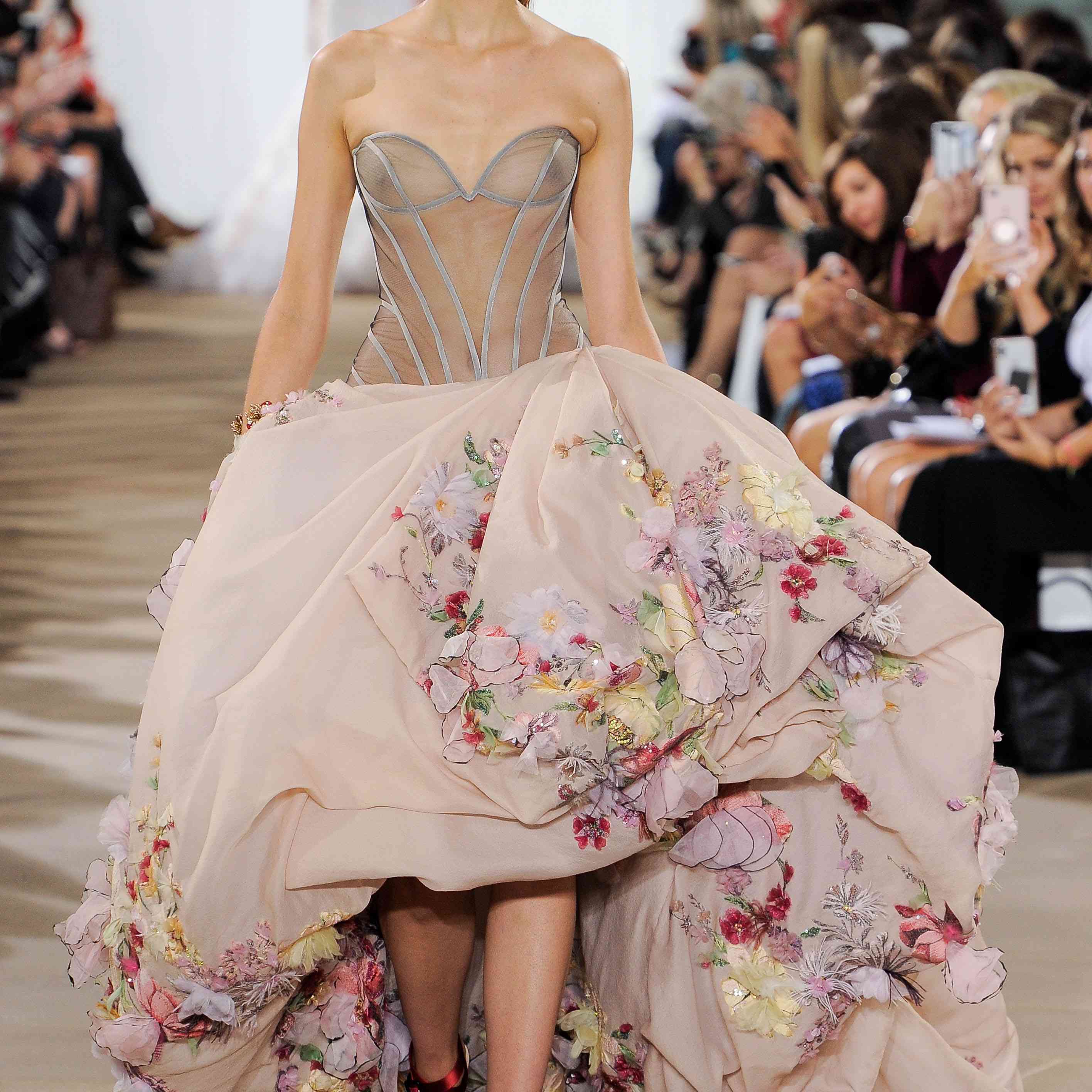“崇高,”美人鱼剪影礼服紧身衣细节和花卉刺绣