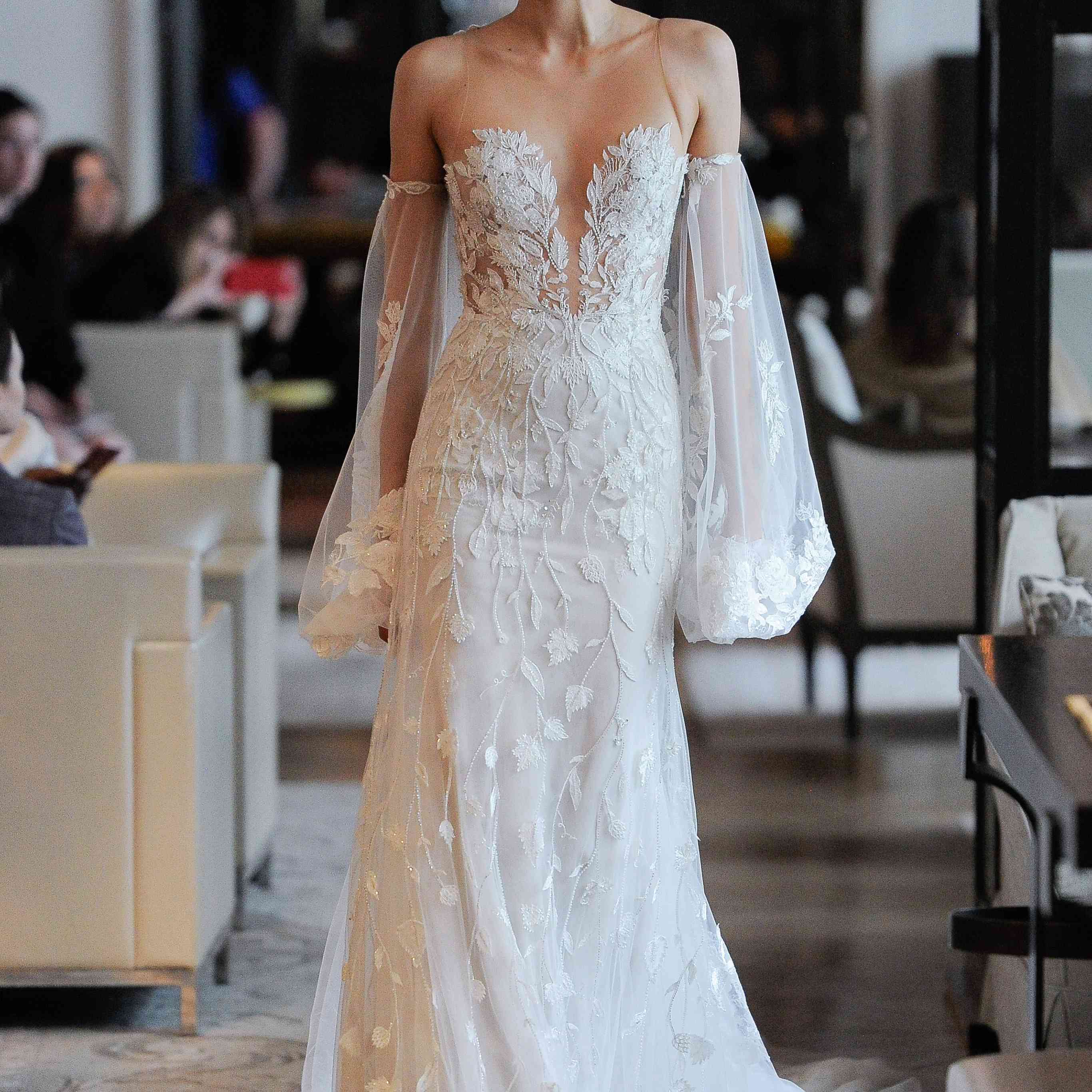 “纳拉”改装喇叭礼服,带有招牌幻影较低的背部和缀饰可拆卸的长诗人袖子,ines di santo